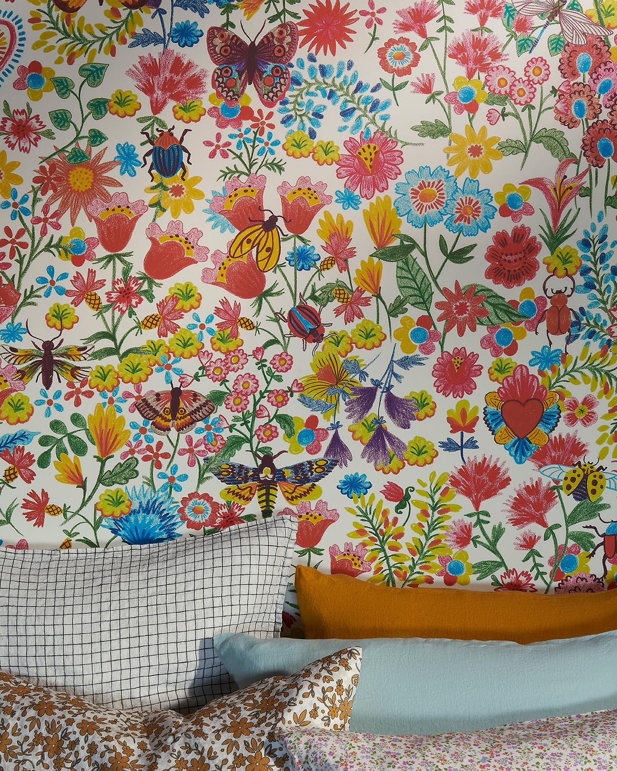 Création de l’artiste Camille Gressier réalisée aux crayons de couleur et pastels gras où camomilles, œillets, anémones mais aussi papillons annoncent le printemps avec gaieté. Impression sur intissé mat grande largeur.