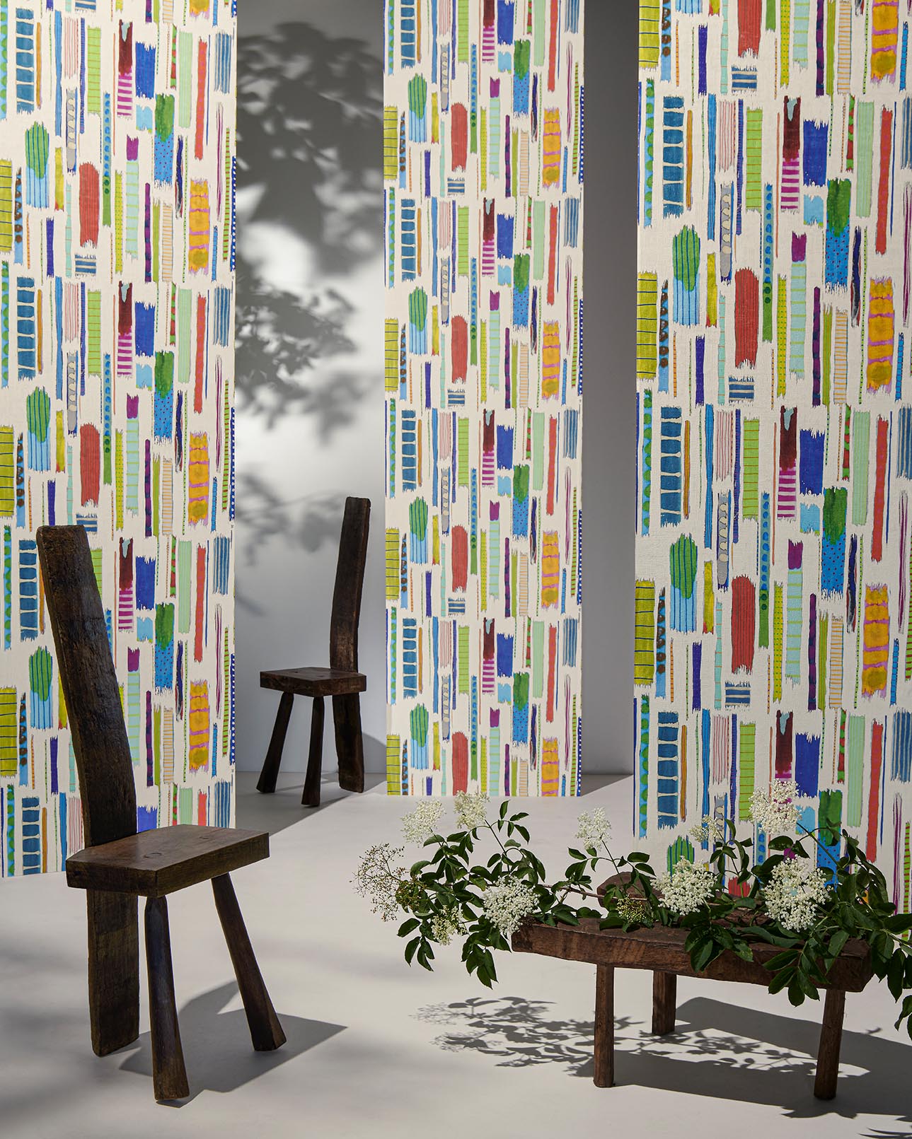 A l’image d'un porte-bonheur ou d'un gri-gri, les taches de couleurs s’assemblent dans une composition rythmée et joyeuse. Impression au rouleau sur vinyle gaufré à l’aspect toile de lin sur intissé.