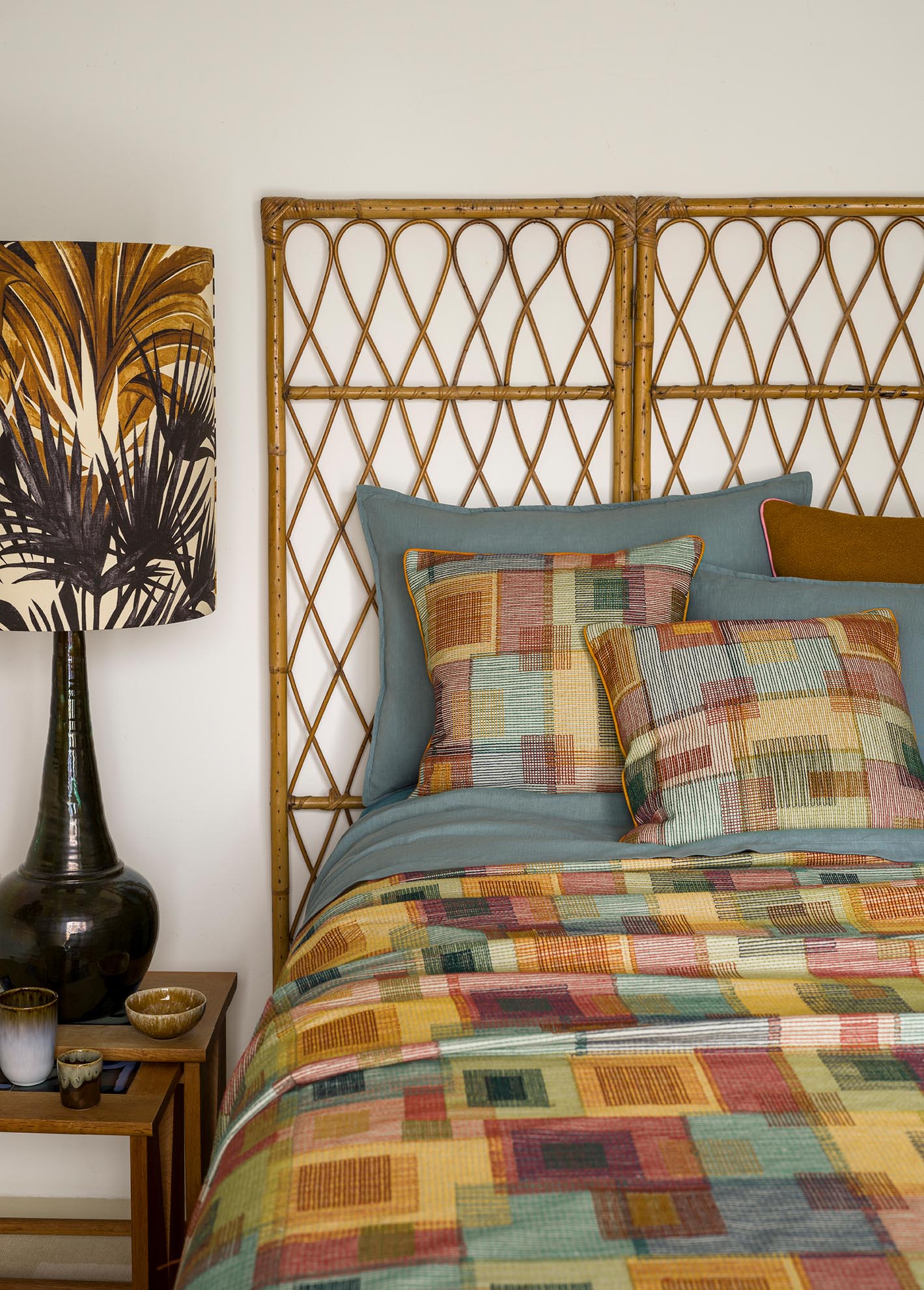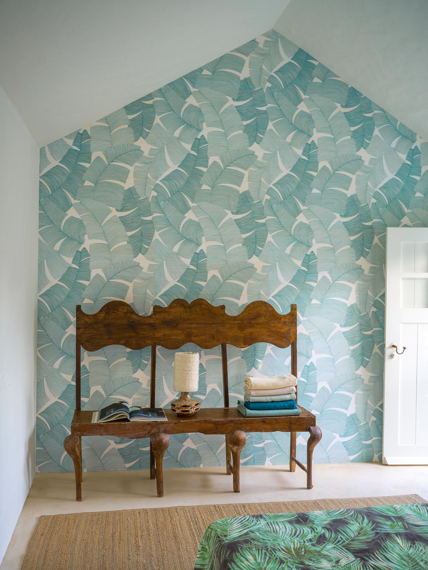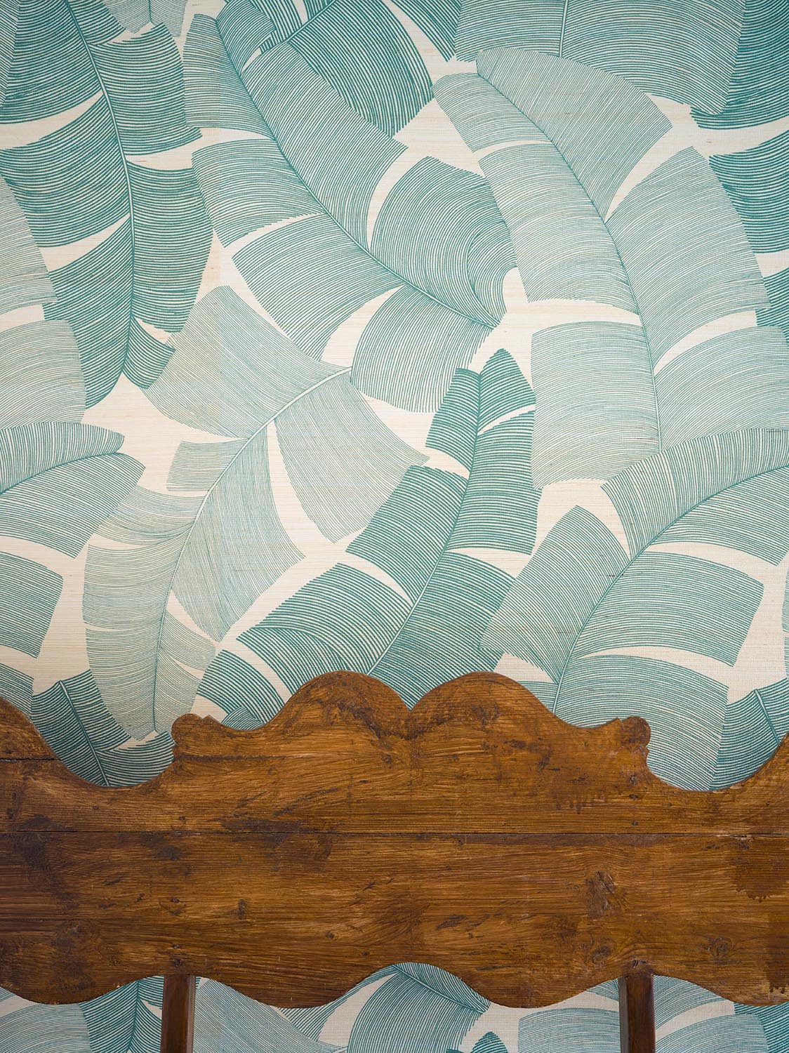 Escale végétale au cœur de la jungle où l’abondance des feuilles de palmier rythme le motif imprimé sur un support paille contrecollé sur intissé.