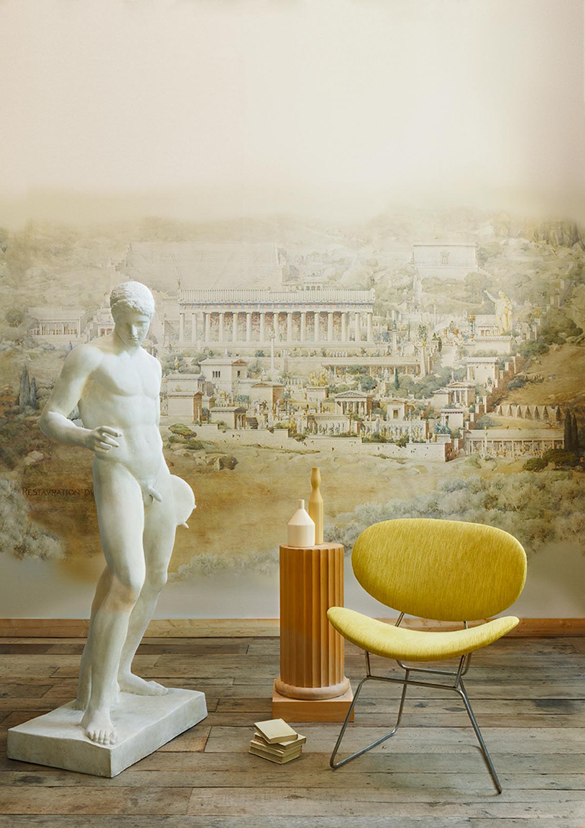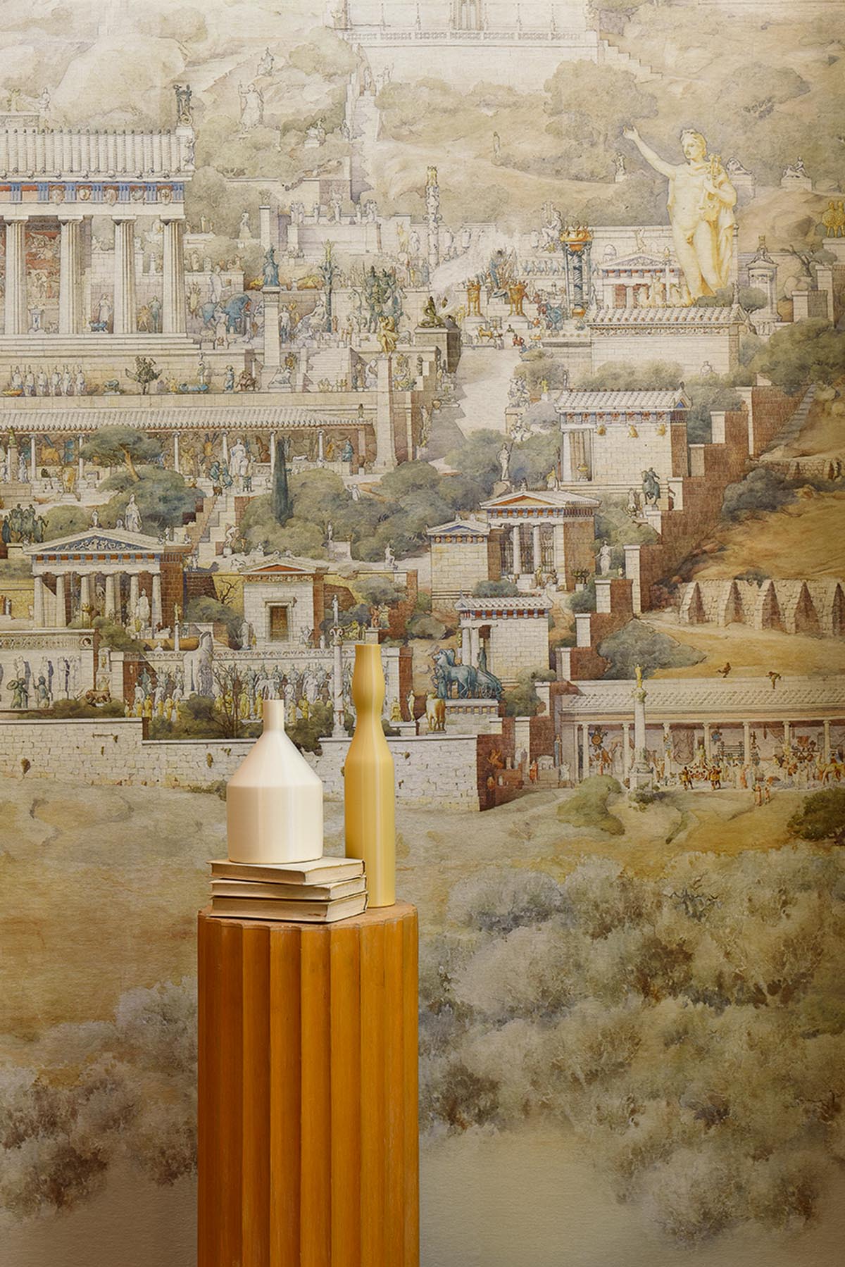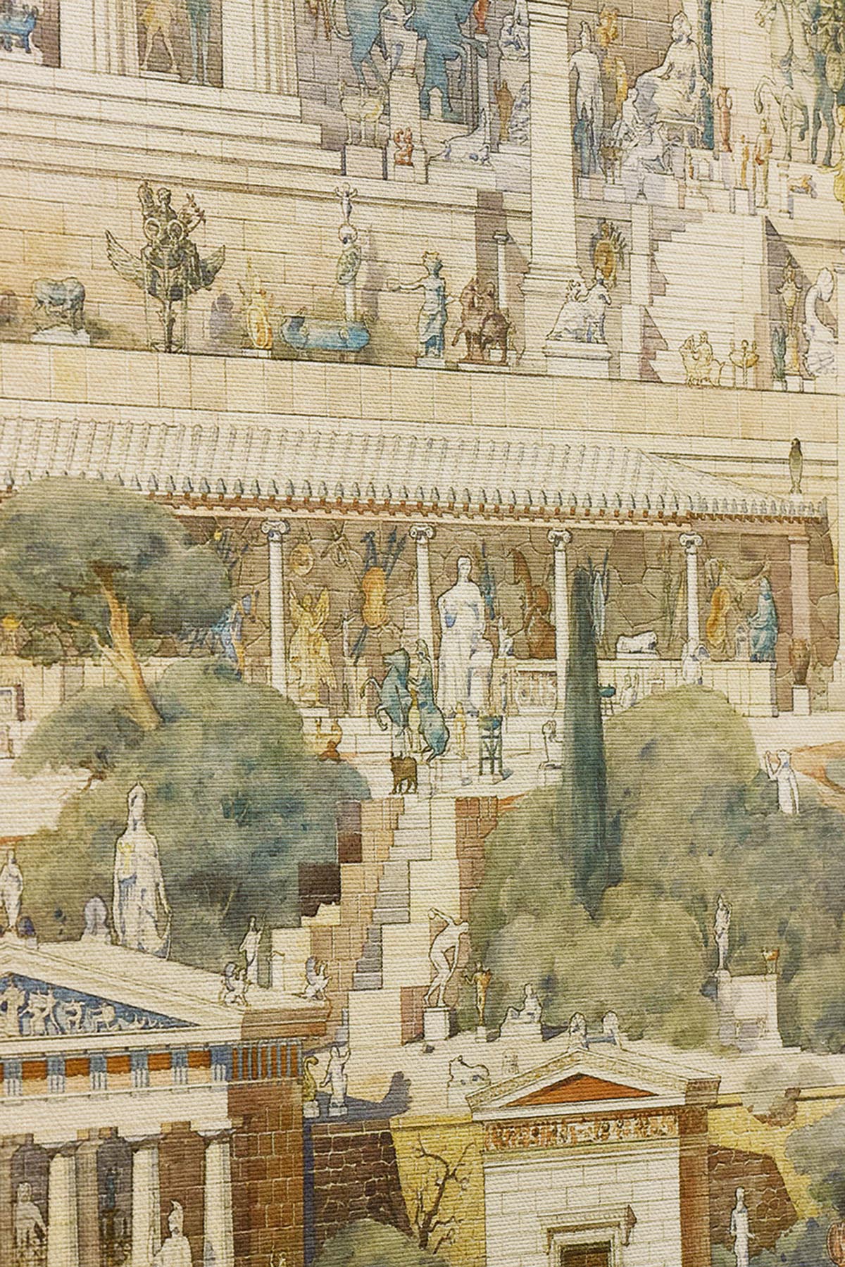 Réinterprétation d’une aquarelle sur tracé à l’encre brune d’Albert Tournaire, étudiant en architecture. Cette œuvre illustre la restauration du sanctuaire d’Apollon à Delphes en 1894. D’une grande précision, elle évoque la grandeur de cette cité antique et fait revivre le souvenir d’une civilisation disparue. Impression sur un support textile aux subtils reflets métalliques contrecollé sur intissé évoquant les tapisseries. L’œuvre originale est conservée au musée des Beaux-Arts de Paris. ©image Beaux-arts de Paris