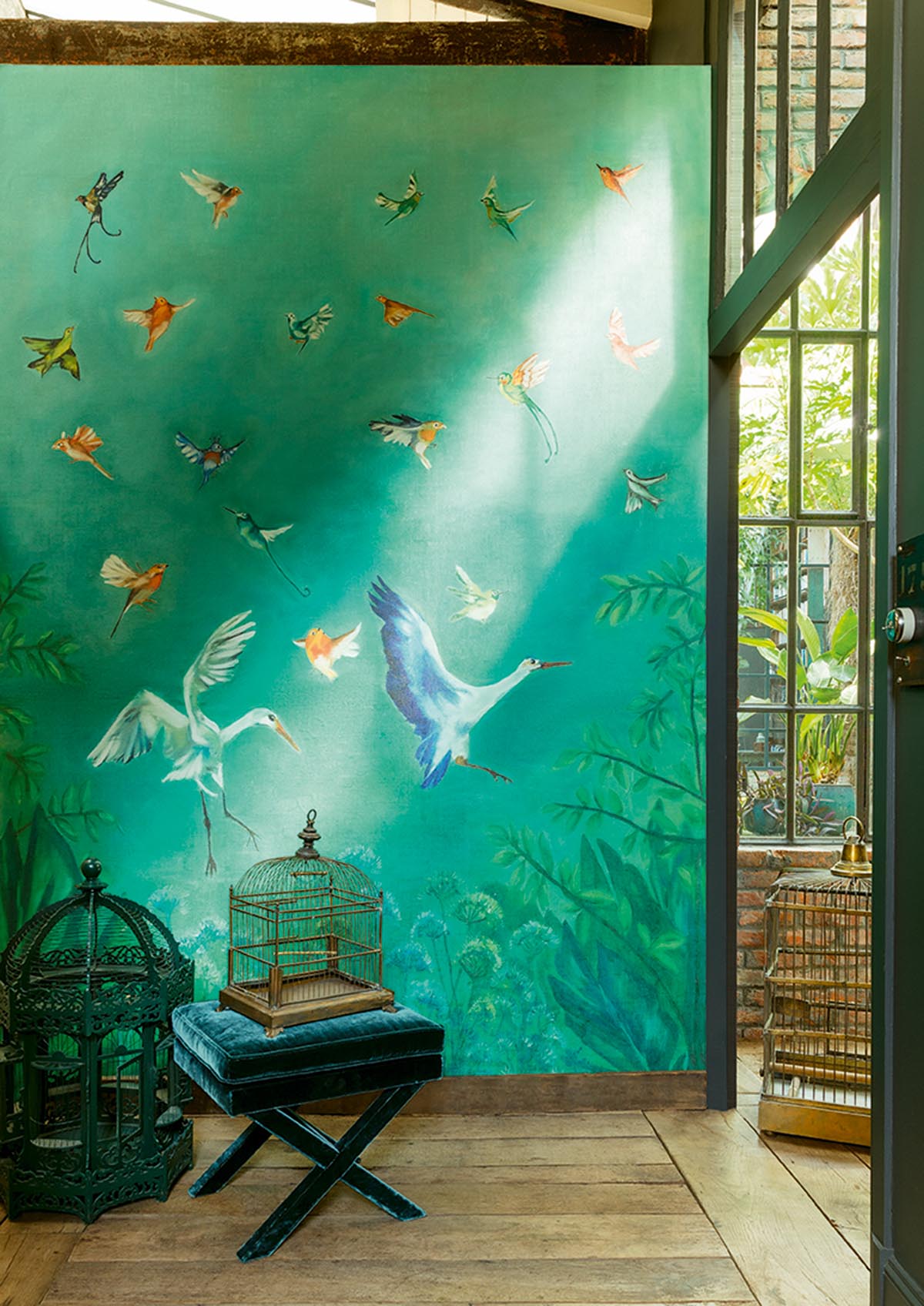 Un coin de paradis, une nature innocente, les oiseaux au plumage de toutes les couleurs dansent et ouvrent une douce perspective. La peinture à l’huile, les traits de pinceau légers et libres créent le mouvement et ouvrent l’espace. Imprimé sur vinyle gaufré à l’effet toile contrecollé sur intissé.