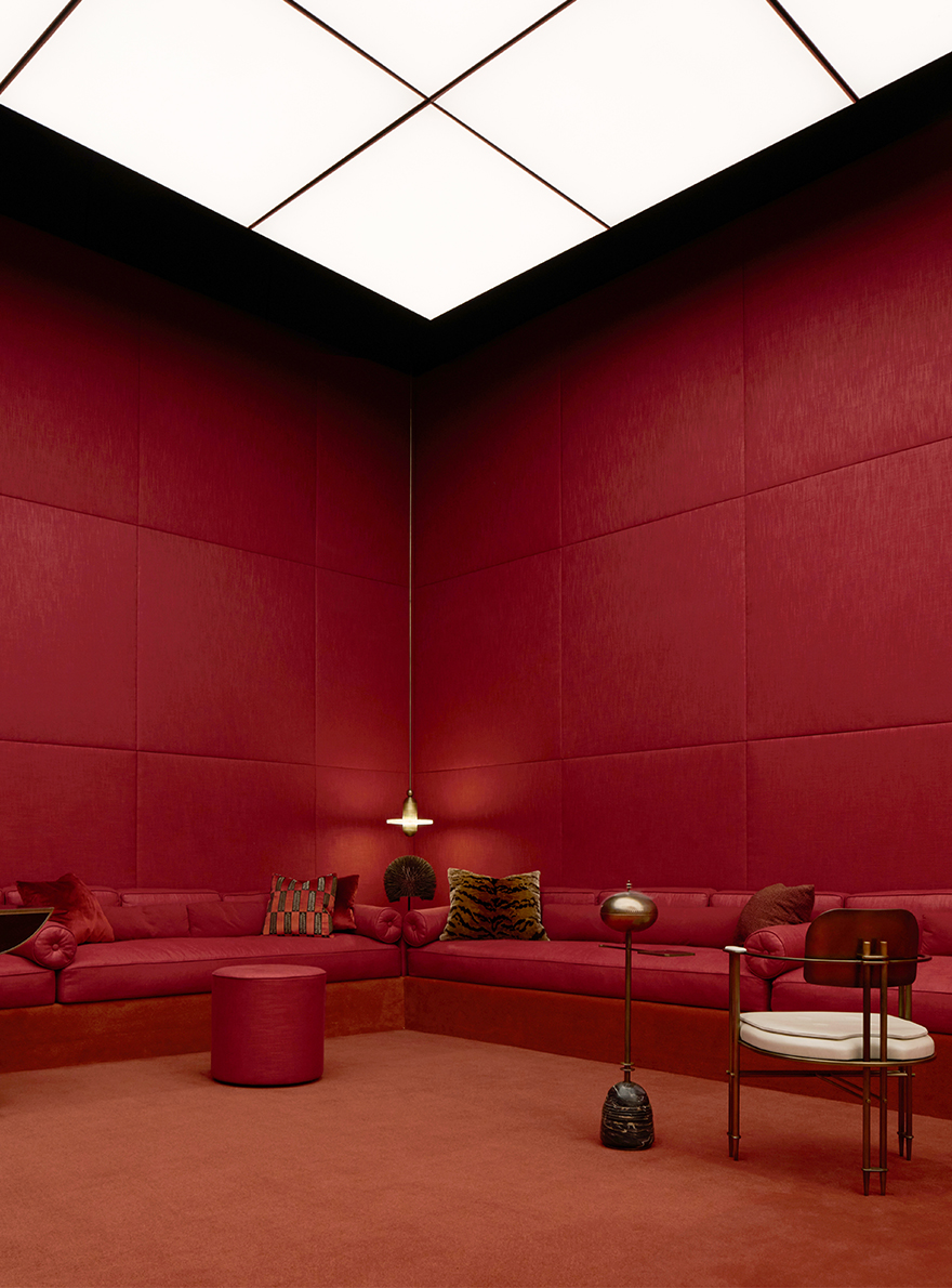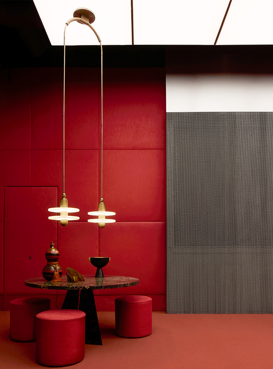 Les canapés-banquettes et les poufs disposés dans la pièce sont recouverts de l’uni texturé PORTOFINO de la Maison Pierre Frey dans une teinte cerise dense. Conçue telle une fusion du « Jardin en Enfer » de la rédactrice de mode Diana Vreeland et de « 2001 : l'Odyssée de l'Espace » de Stanley Kubrick revisité par le cinéaste Federico Fellini, cette installation propose une vision théâtrale avec pour personnage central une statue en bronze de Phaéton, fils d’Hélios dieu du Soleil. Pour contraster avec l’ambiance monochrome du lieu, des caissons lumineux placés au plafond et des encadrements en métal armé à l'intérieur de la pièce délimitent les espaces tout en apportant une touche futuriste.