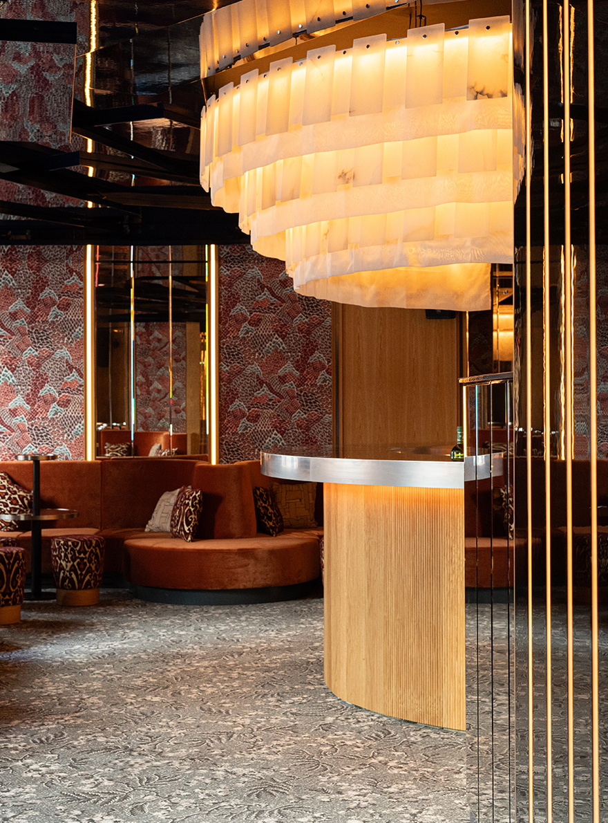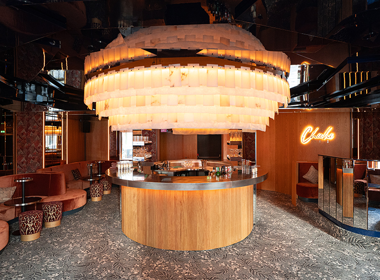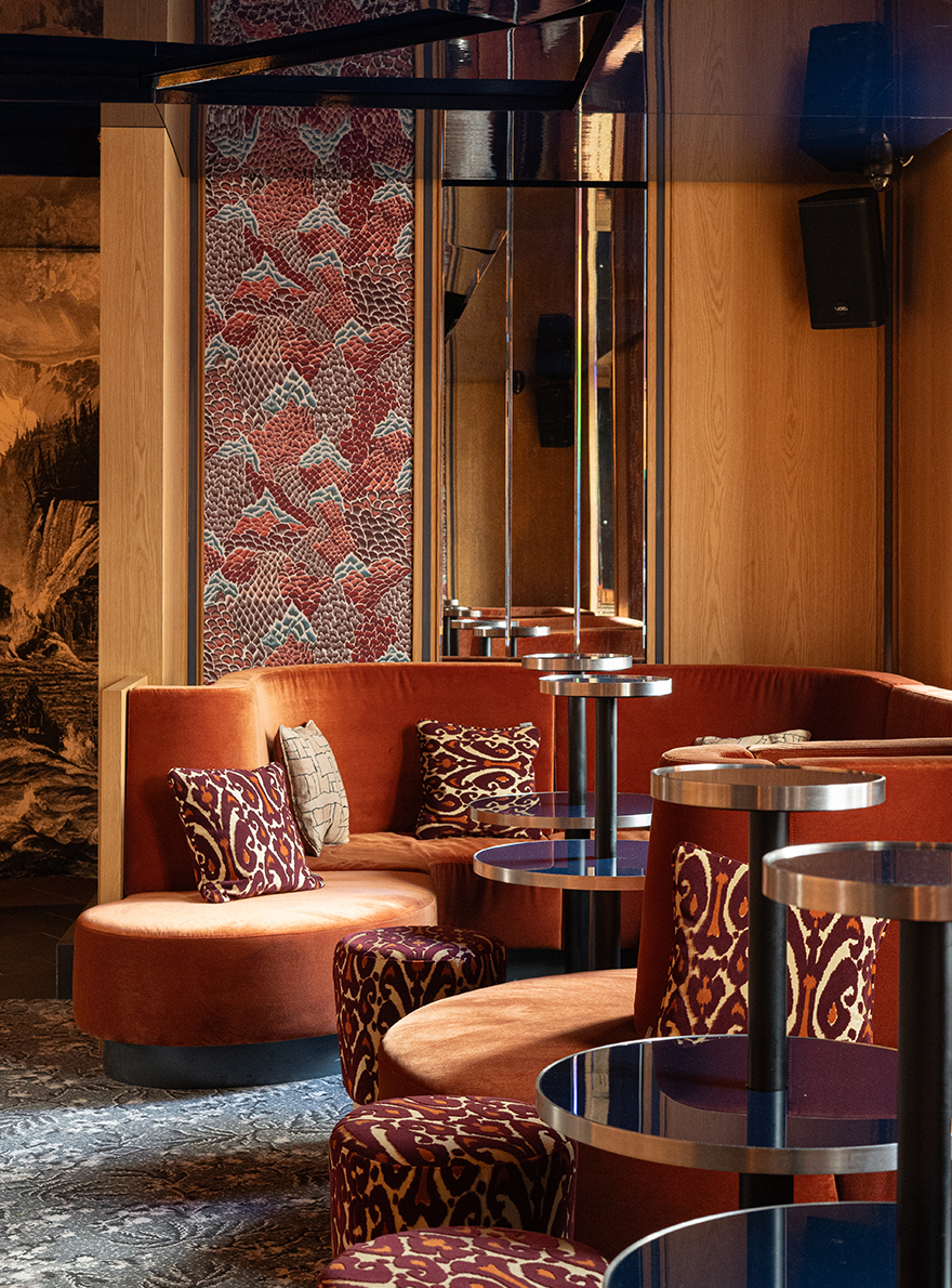 Véritable théâtre des festivités, la grande salle en alcôve possède en son centre un bar majestueux baigné d’une lumière tamisée qui enveloppe délicatement la pièce. Cette ambiance feutrée sublime la richesse des motifs et des textures des étoffes sélectionnées. Aux murs, LE ROCHER, un classique intemporel de la Maison Braquenié au motif en all-over insuffle un effet décoratif saisissant à l’espace. Le motif ikaté du velours haute performance SOVERATO habille quant à lui les assises de sa teinte éclatante. L’inspiration japonaise s’exprime dans l’utilisation du jacquard NAOKI et son patchwork de formes graphiques contemporaines ainsi que par le choix de la moquette ALBIZIA dont le motif floral en camaïeu de gris rythme l’espace. Cet ensemble aux accents extrême-orientaux concoure au voyage sensoriel et culinaire des convives. Chichi Paris incarne ainsi une alchimie parfaite entre tradition et modernité, offrant à ses hôtes une parenthèse envoûtante et festive derrière ses portes feutrées, où l’effervescence et l’élégance se rencontrent pour une expérience hors du commun.