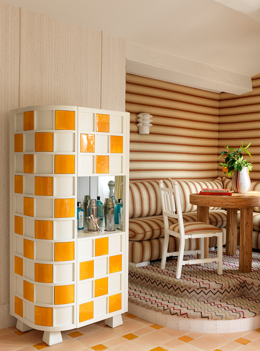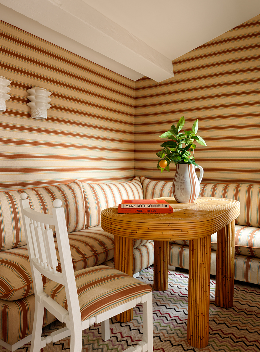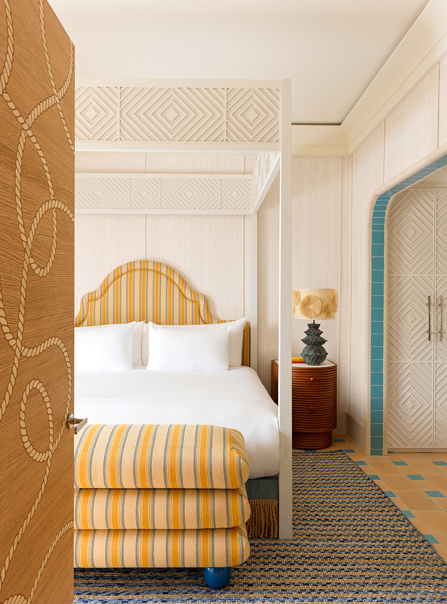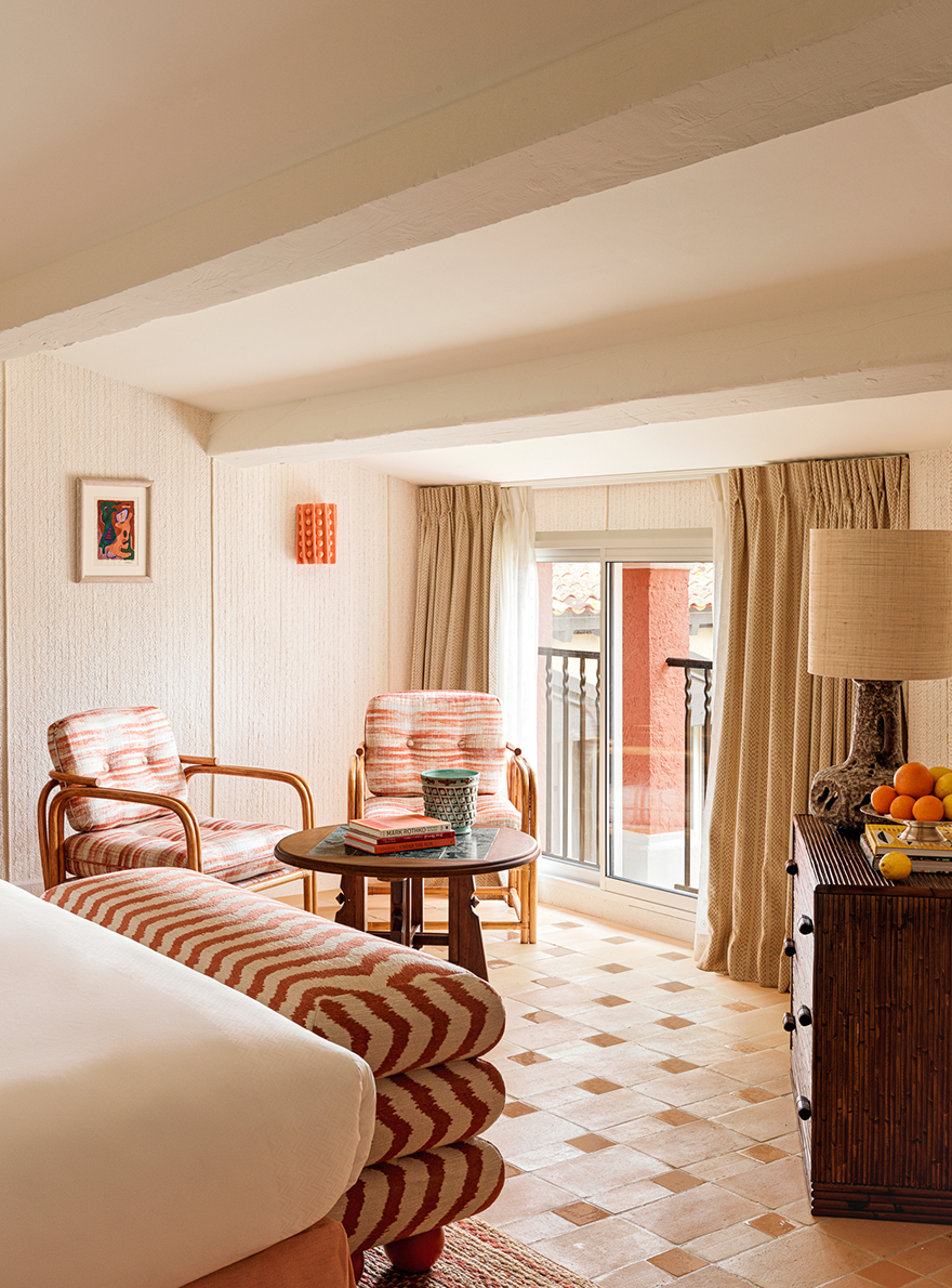 Inspirée par l’ambiance méditerranéenne du lieu et les harmonies de couleurs solaires et minérales qui en découlent, l’architecte et décoratrice d’intérieur a fait le choix d’utiliser les Toiles de Tours BIARRITZ BAYADERE et TSOMBA pour habiller têtes de lit dans des tonalités jaune. On retrouve également sur les assises des suites le contre-fond VERMICULLI chez Thorp of London dans une teinte bleu délicate et le motif d’ikat de WAIKIKI dont la teinte terracotta n’est pas sans rappeler les façades des maisons provençales.