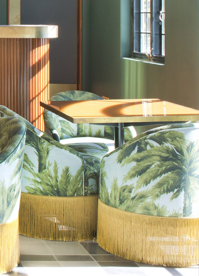 Dans le bar de l’hôtel, l’imprimé-phare Pierre Frey MAURITIUS à motif palmiers disposé sur les fauteuils-crapauds à franges apporte la touche évocatrice indispensable à cette ambiance chic et décontractée imprégnée d’un esprit colonial.
