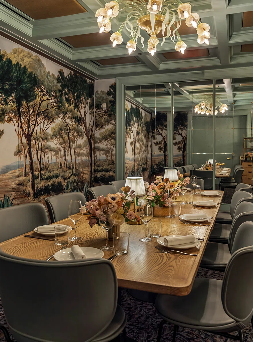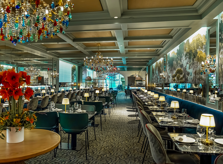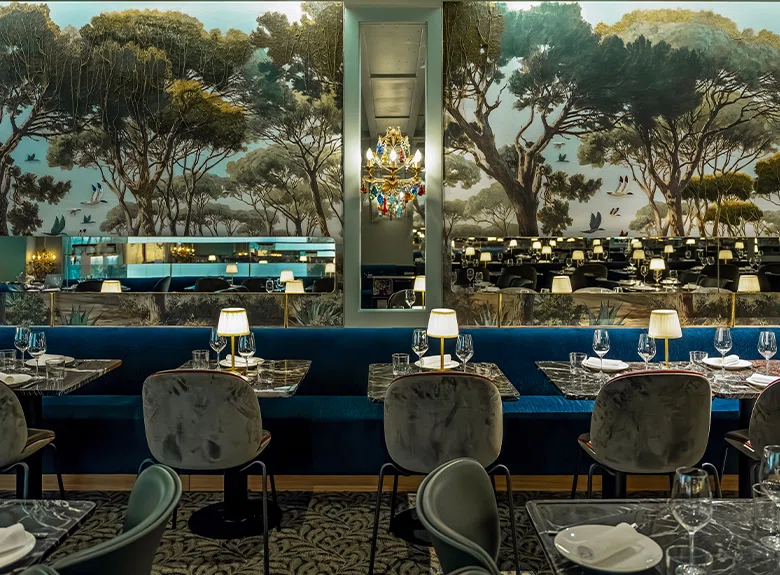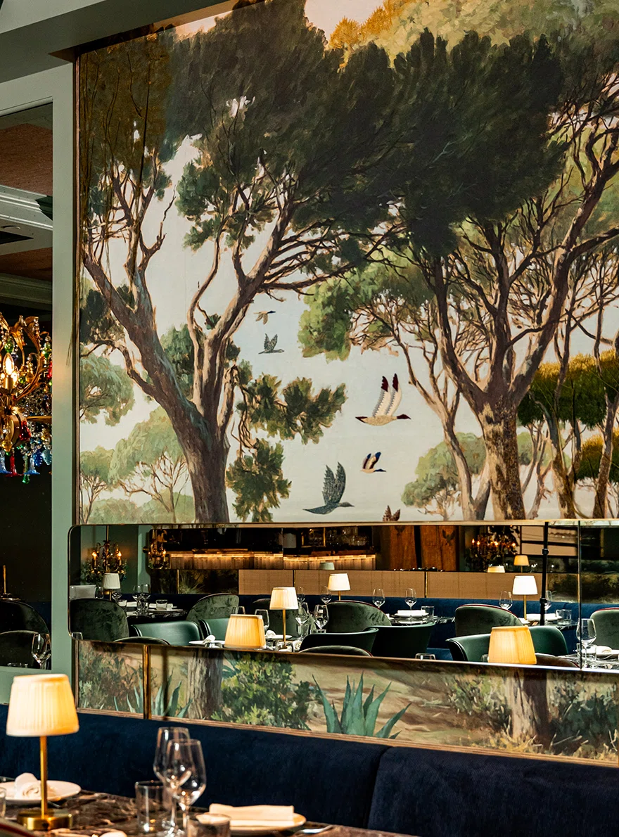 Conçu par Nasser Nakib Architects, le décor du restaurant allie raffinement et opulence. Les touches dorées, les lustres incrustés de pierres précieuses et le mur de miroirs se marient avec élégance au panoramique L'ESTEREL de la Maison Pierre Frey. Retravaillé dans une version sur mesure, le papier peint, ici orné d’oiseaux brodés s’élevant entre les cimes des arbres, insuffle un mouvement subtil aux murs de la salle de réception, renforçant les jeux d’ombre et de lumière. Au sol, la moquette axminster WINDS, au graphisme vibrant, rythme cet espace d’exception.