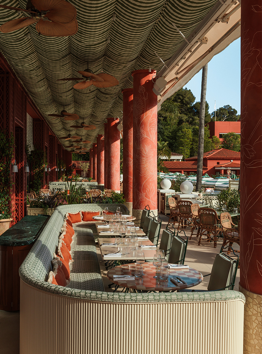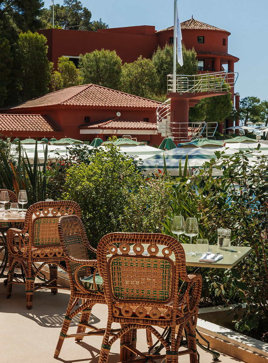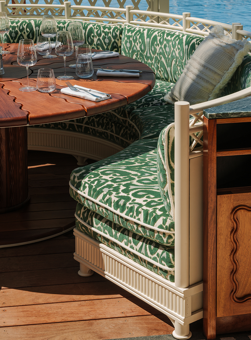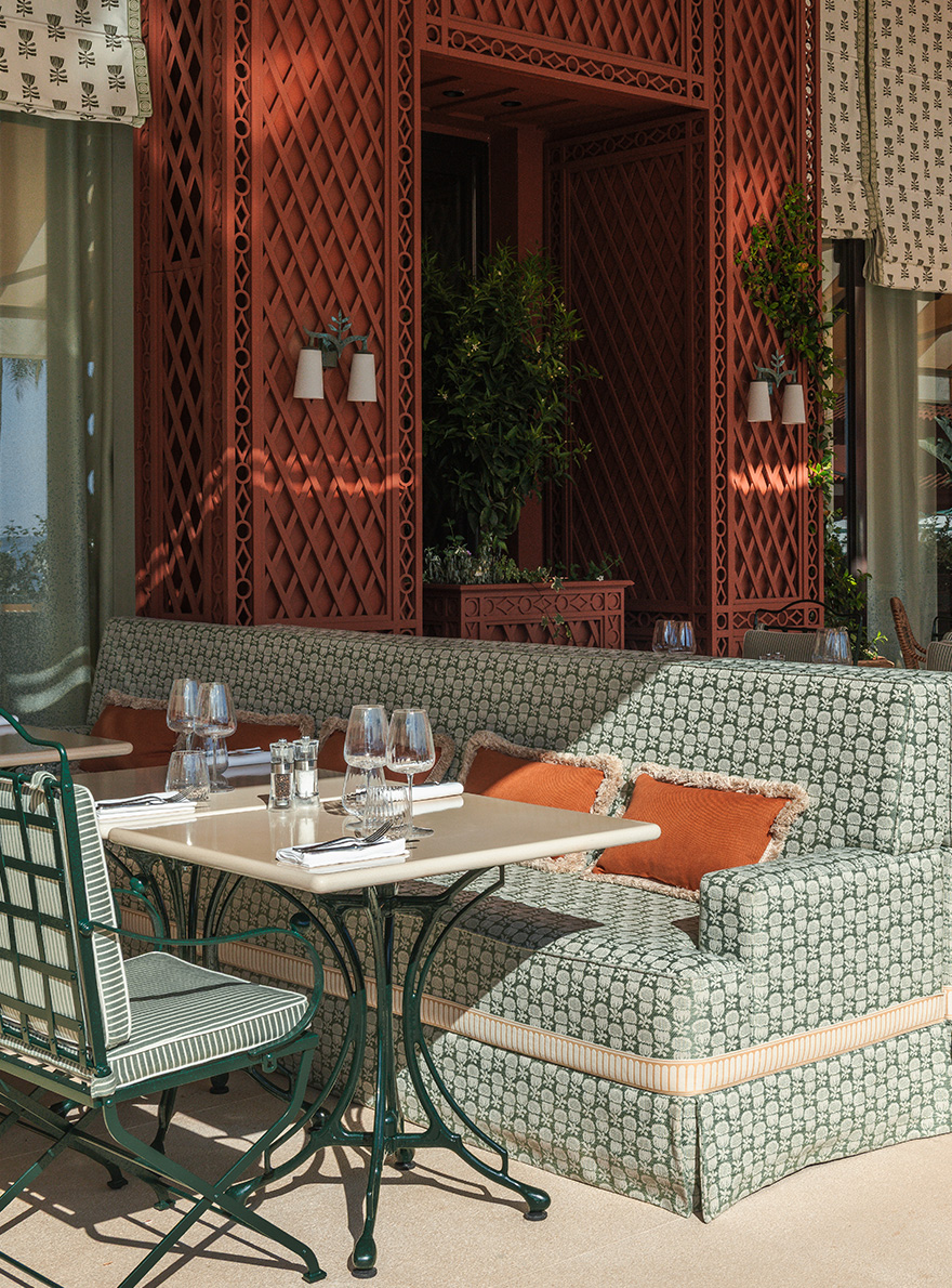 Entre souvenirs et héritage, l’atmosphère, baignée de lumière, y est joyeuse et élégamment décontractée. Installé dans un site naturel d’exception, chaque détail a été pensé pour inscrire le club dans une harmonie subtile avec son environnement. Cette volonté se traduit notamment dans le choix des matériaux, à la fois durables et adaptés aux exigences du bord de mer, avec un accent particulier mis sur les textiles aux performances outdoor. Ainsi, le motif floral LES CHARDONS de la Maison Le Manach, retravaillé dans une version outdoor exclusive, habille les banquettes de son esprit graphique et intemporel. Il est accompagné de la douce rayure OTRANTE dans une teinte céladon et de la toile de lin GOLFE, dont la nuance terracotta, lumineuse et vibrante, vient dynamiser les assises du restaurant. Le velours SOVERATO complète l’ensemble avec son délicat motif d’ikat rappelant la vannerie traditionnelle.