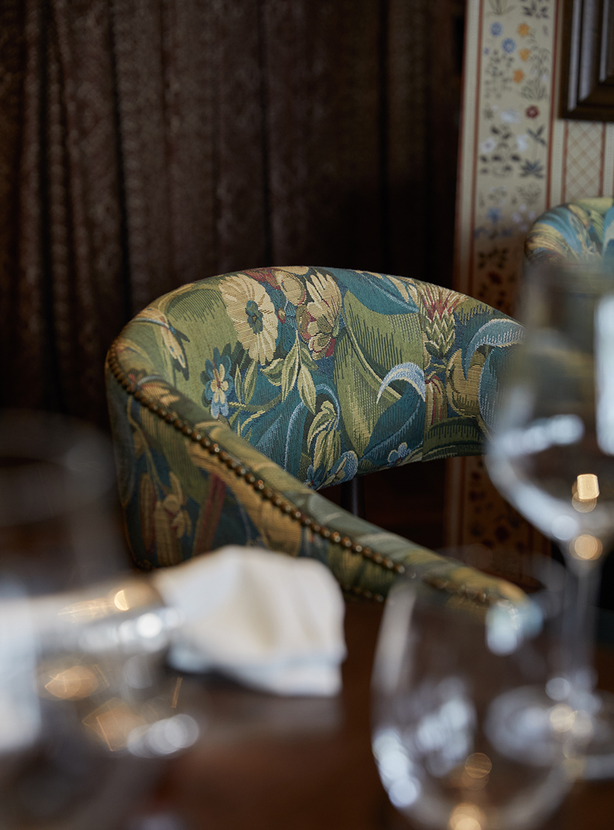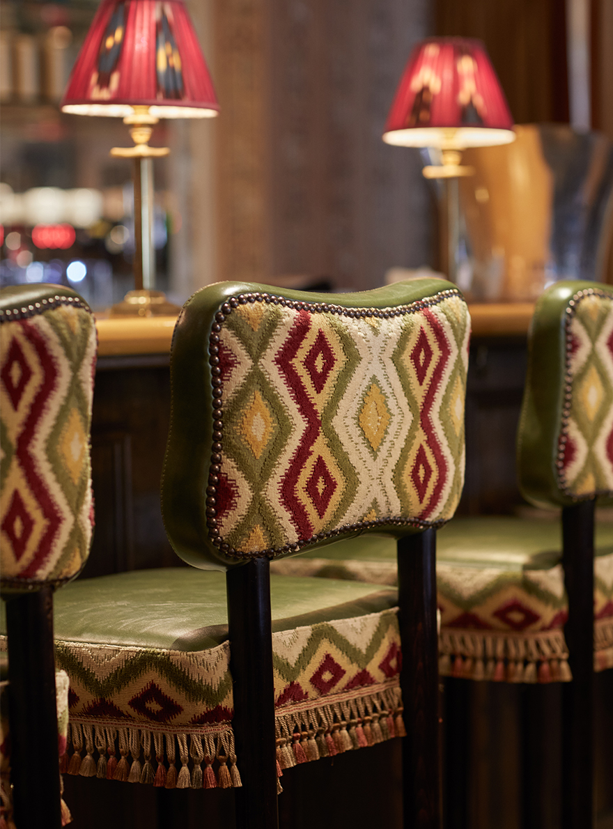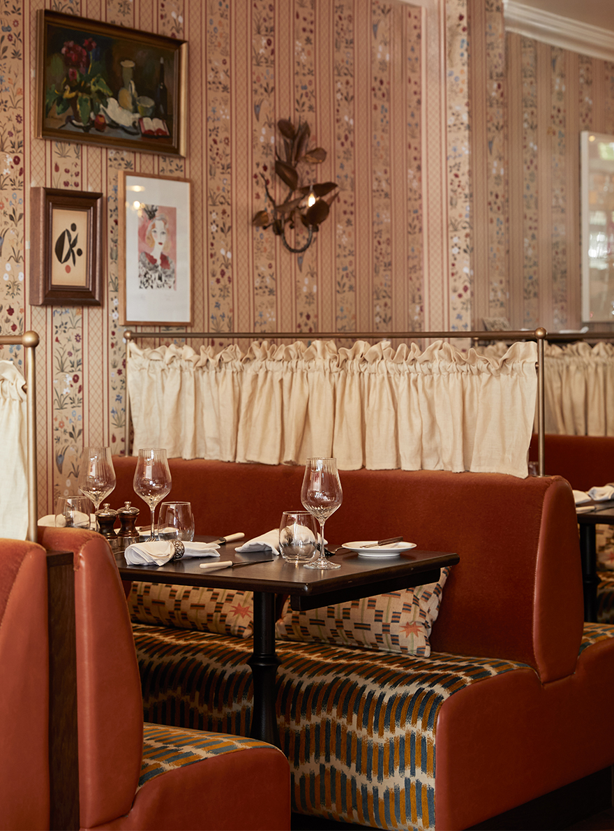 À l’intérieur, les couleurs riches et vibrantes, associées à des tables soigneusement disposées, sont propices à des moments de convivialité et de plaisir. Les différents espaces sont sublimés par la richesse des collections de la Maison Pierre Frey illustrant l’alliance du savoir-faire artisanal et de la créativité. On retrouve le charme de la tapisserie jacquard EPERNON dont le motif de feuillage et de libellules insuffle une touche de poésie à la salle de réception. La chaleur enveloppante du velours TEDDY MOHAIR associée à la toile de Tours DUCHESSE et ses bandes verticales ondulantes rythment les banquettes d’une élégance graphique. La décoration du lieu, audacieuse et sophistiquée, multiplie les associations de matières et de textures. Le velours épinglé MONTRESOR, au motif de pois, côtoie l’ikat raffiné du velours VOUVRAY, tandis que la toile de Tours BENIN apporte une touche d’exotisme avec son esprit africain. Chaque élément, de la tapisserie TIBERE caractéristique des verdures du XVIIe siècle, jusqu’au papier peint LA YOURTE DU NOMADE revisitant les textiles persans, contribue à faire du Julie’s une ode à l’art de vivre où tradition et modernité se rencontrent habilement.