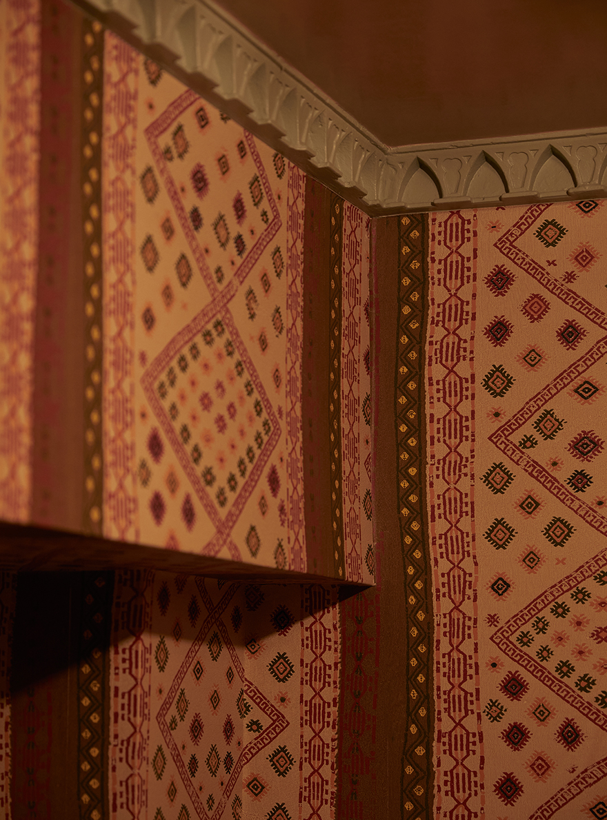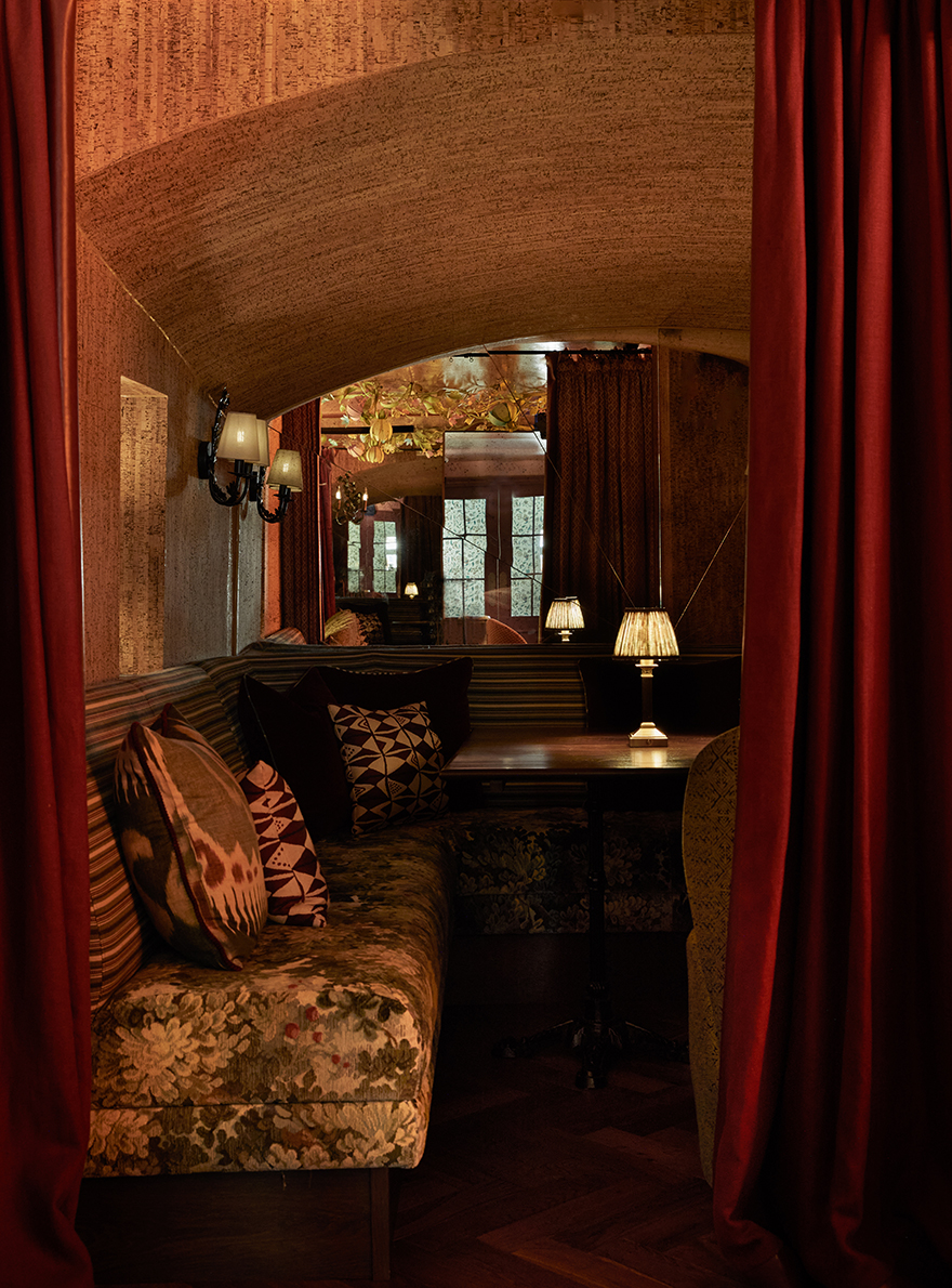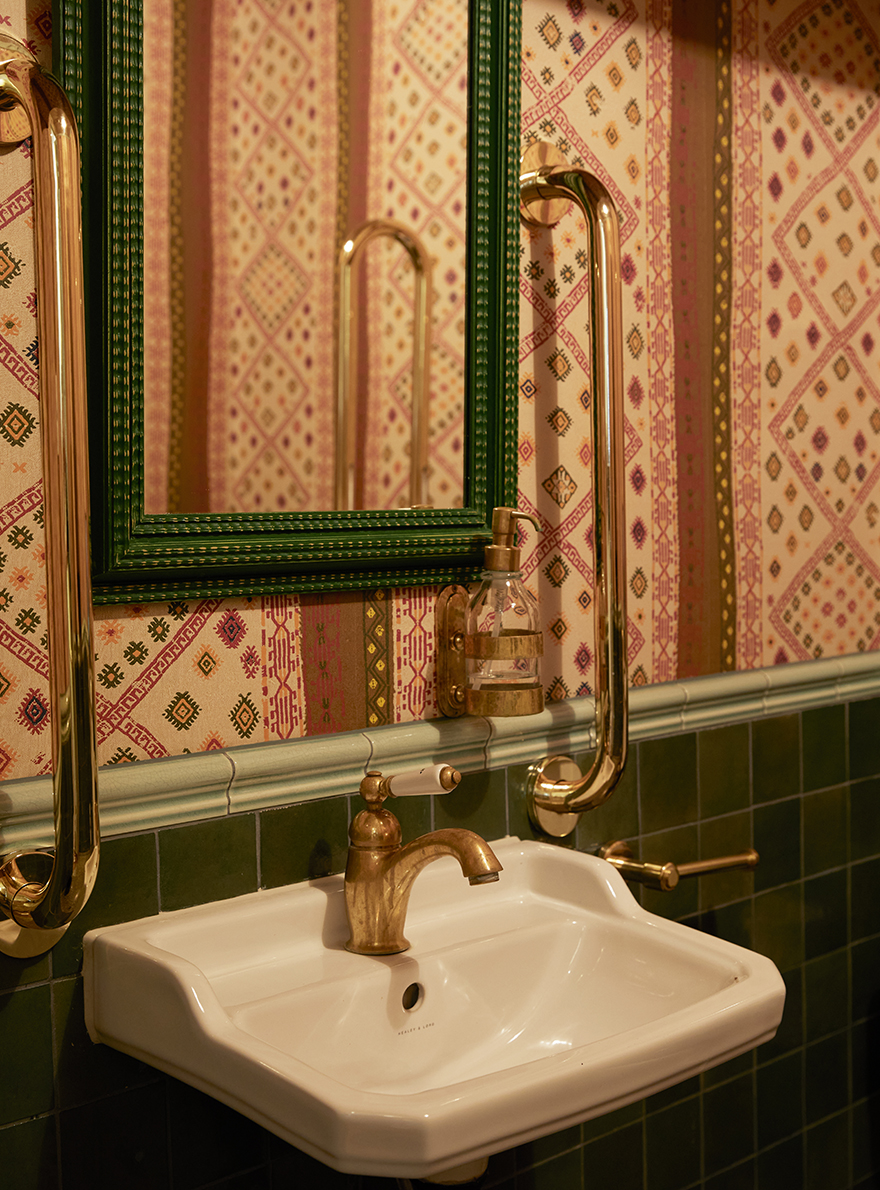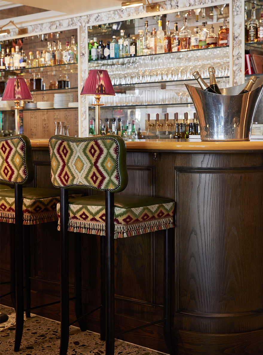 À l’intérieur, les couleurs riches et vibrantes, associées à des tables soigneusement disposées, sont propices à des moments de convivialité et de plaisir. Les différents espaces sont sublimés par la richesse des collections de la Maison Pierre Frey illustrant l’alliance du savoir-faire artisanal et de la créativité. On retrouve le charme de la tapisserie jacquard EPERNON dont le motif de feuillage et de libellules insuffle une touche de poésie à la salle de réception. La chaleur enveloppante du velours TEDDY MOHAIR associée à la toile de Tours DUCHESSE et ses bandes verticales ondulantes rythment les banquettes d’une élégance graphique. La décoration du lieu, audacieuse et sophistiquée, multiplie les associations de matières et de textures. Le velours épinglé MONTRESOR, au motif de pois, côtoie l’ikat raffiné du velours VOUVRAY, tandis que la toile de Tours BENIN apporte une touche d’exotisme avec son esprit africain. Chaque élément, de la tapisserie TIBERE caractéristique des verdures du XVIIe siècle, jusqu’au papier peint LA YOURTE DU NOMADE revisitant les textiles persans, contribue à faire du Julie’s une ode à l’art de vivre où tradition et modernité se rencontrent habilement.