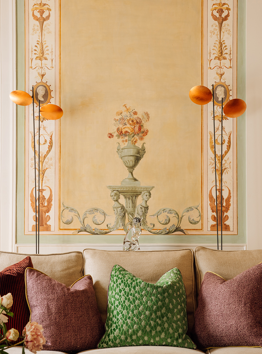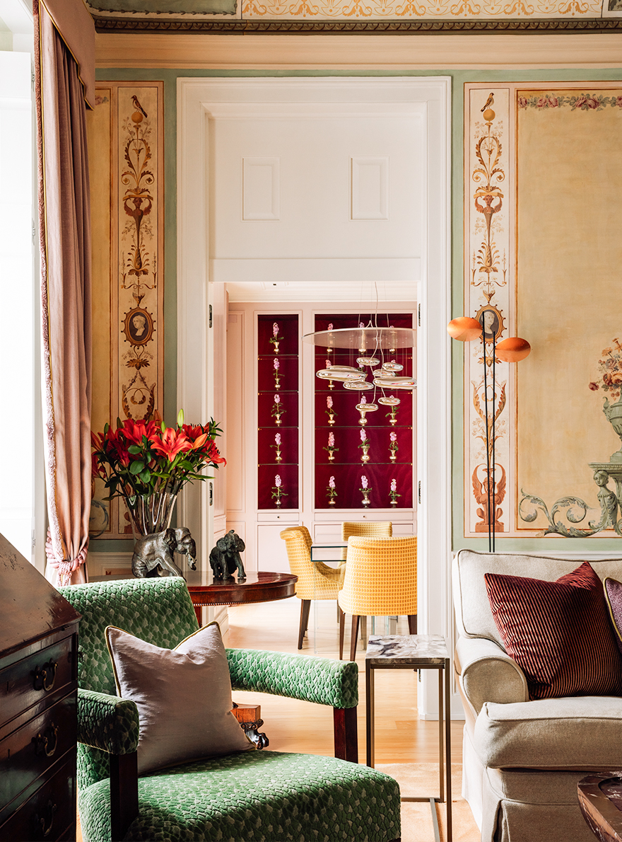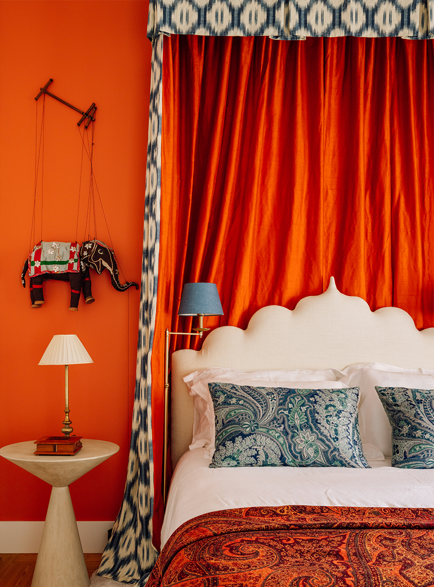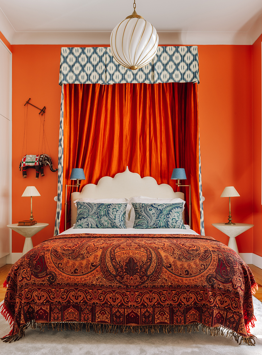 A l’inverse, la chambre principale a été travaillée tel un carnet de voyage aux accents résolument exotiques où les couleurs riches et joyeuses rencontrent l’imprimé sur lin LEANDRE dont le motif géométrique dans une teinte bleu indigo vient souligner ce décor singulier au charme indéniable.