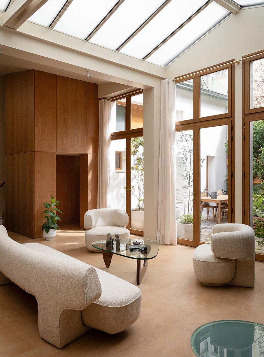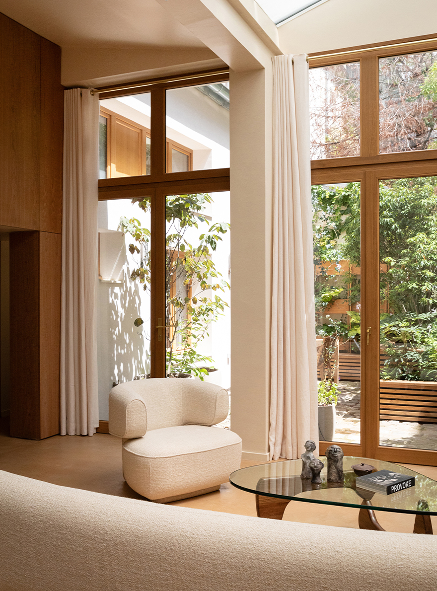 Organisés autour d’un patio richement végétalisé, les espaces font la part belle à la lumière grâce à de grandes ouvertures vitrées en façade qui assurent une fluidité visuelle entre le patio et le salon d'été. Celui-ci s’articule autour de deux fauteuils et d’un canapé banquette de la gamme LITHO dessinée par Guillaume Delvigne pour la Maison Pierre Frey. L'utilisation de couleurs neutres et chaudes mariées à des matériaux nobles tels que le bois et la pierre contribue à créer une atmosphère chaleureuse et ensoleillée rappelant les paysages côtiers.