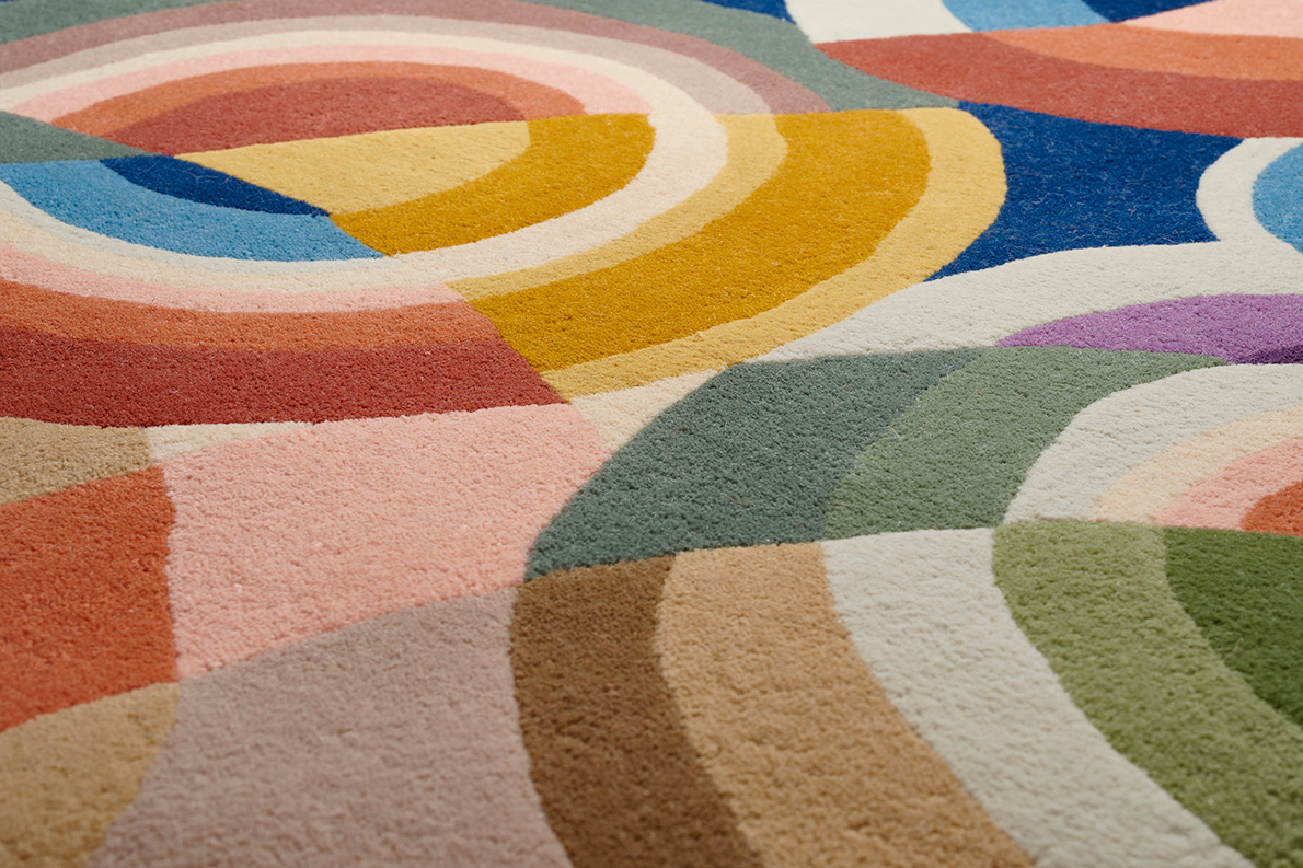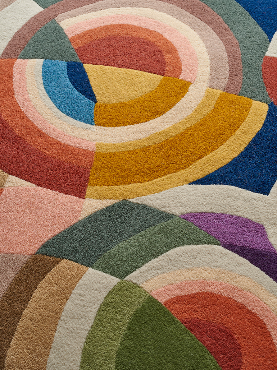 Au départ, une flânerie un soir rue de Verneuil à Paris. Dans la vitrine d'une galerie d'art, un tableau datant des années 20. Cette toile signée Léon Texier devient un très beau tapis tufté-main en velours de laine de Nouvelle-Zélande, dont la composition en cercles concentriques, tend à l'abstraction. Cet artiste méconnu a, semble t'il, été fortement inspiré par les recherches de Sonia et Robert Delaunay sur la couleur pure, le mouvement des couleurs et leur contraste simultané.