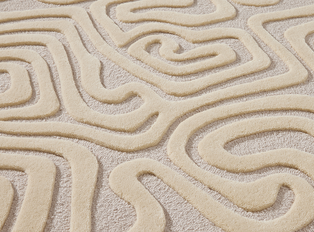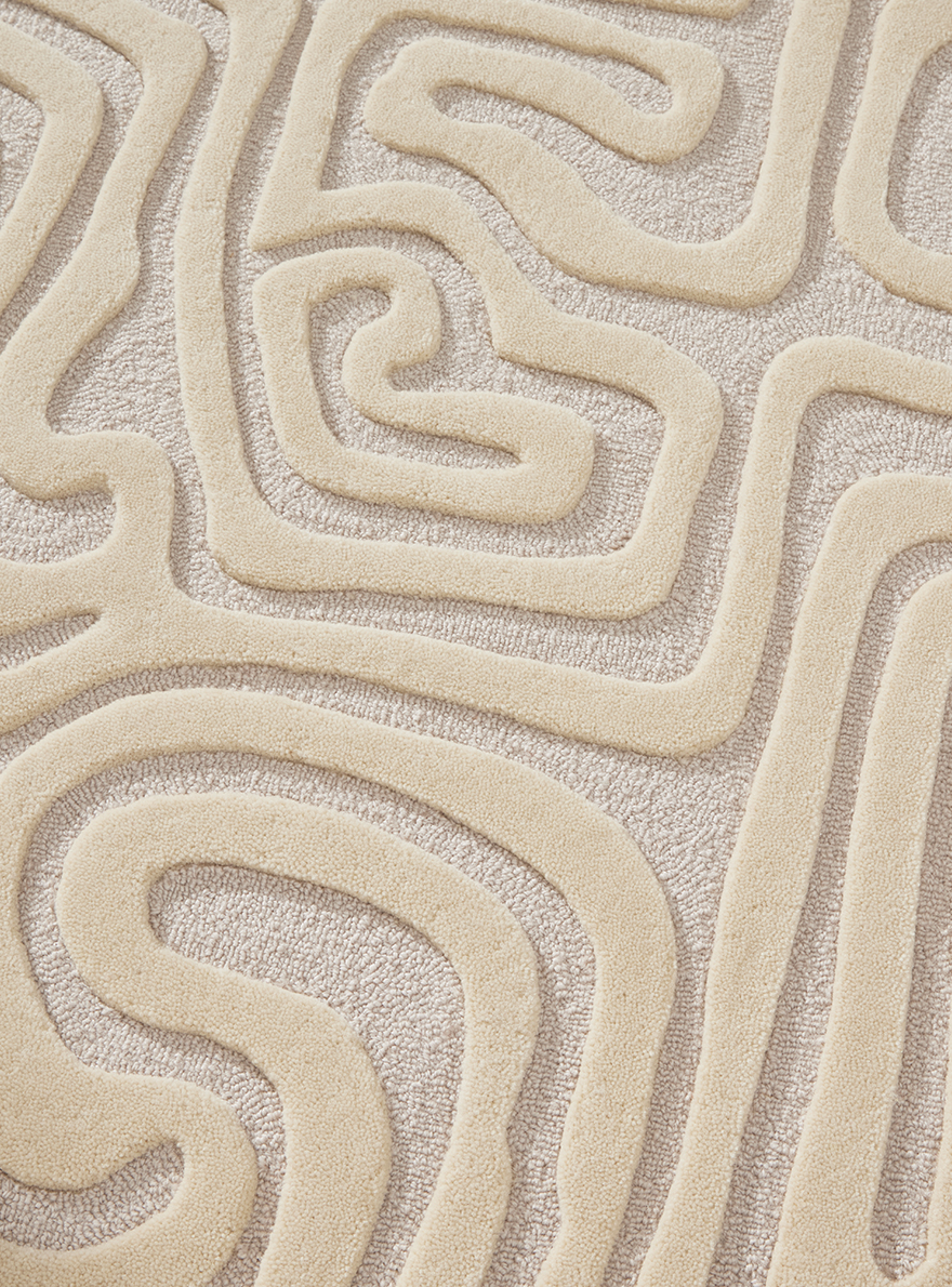 SAMARAI est orné de cercles concentriques en all-over évoquant les peintures sur sable ou roche de l'art aborigène. Ce type de dessin revient de façon récurrente dans cet art. Travaillé en tuft-main, il joue avec un fond en boucles de laine de Nouvelle-Zélande et des traits en velours coupé de laine, comme sculpté en relief.