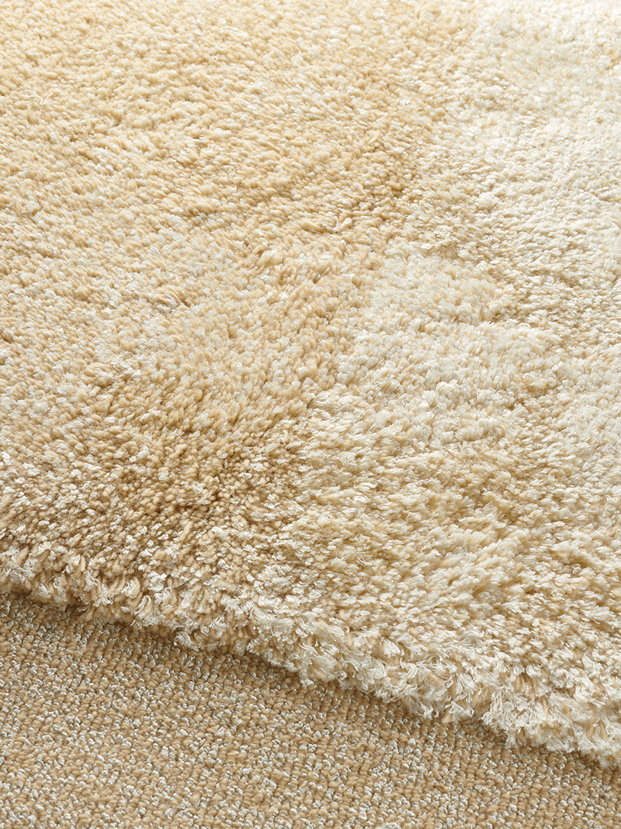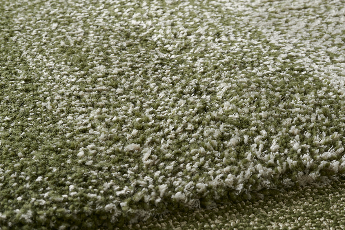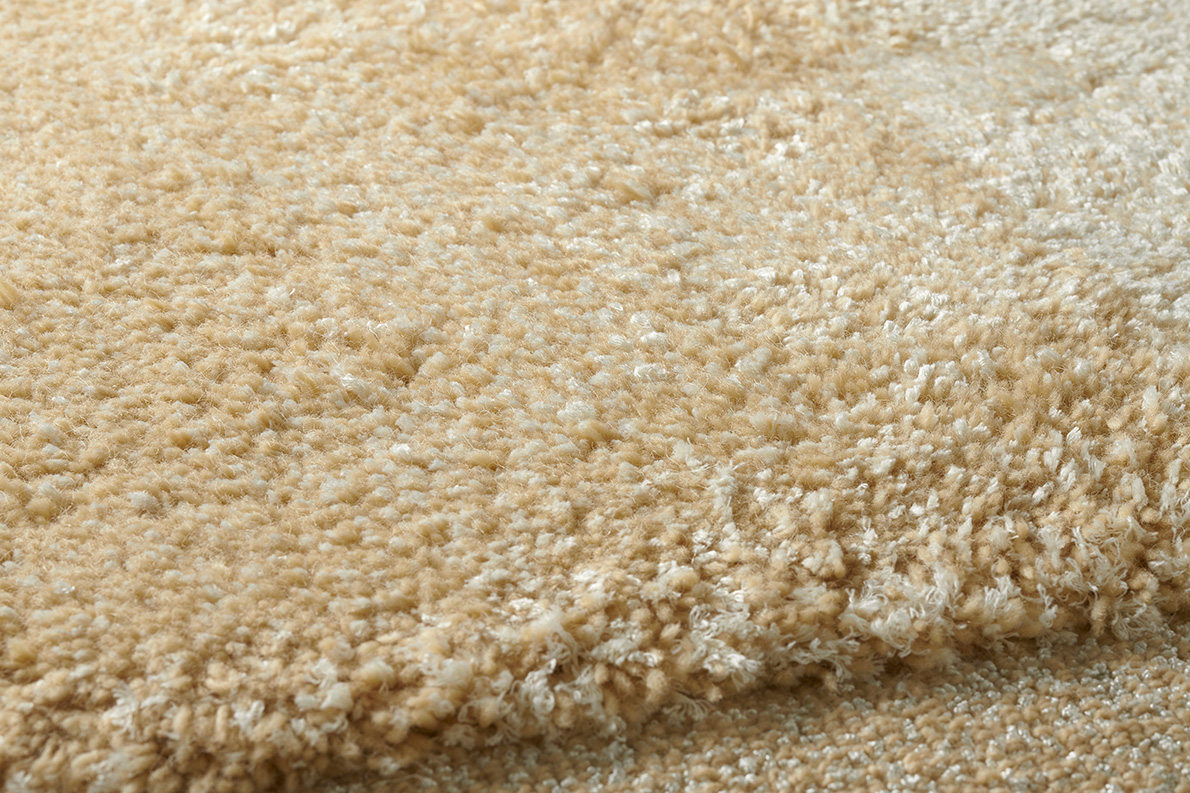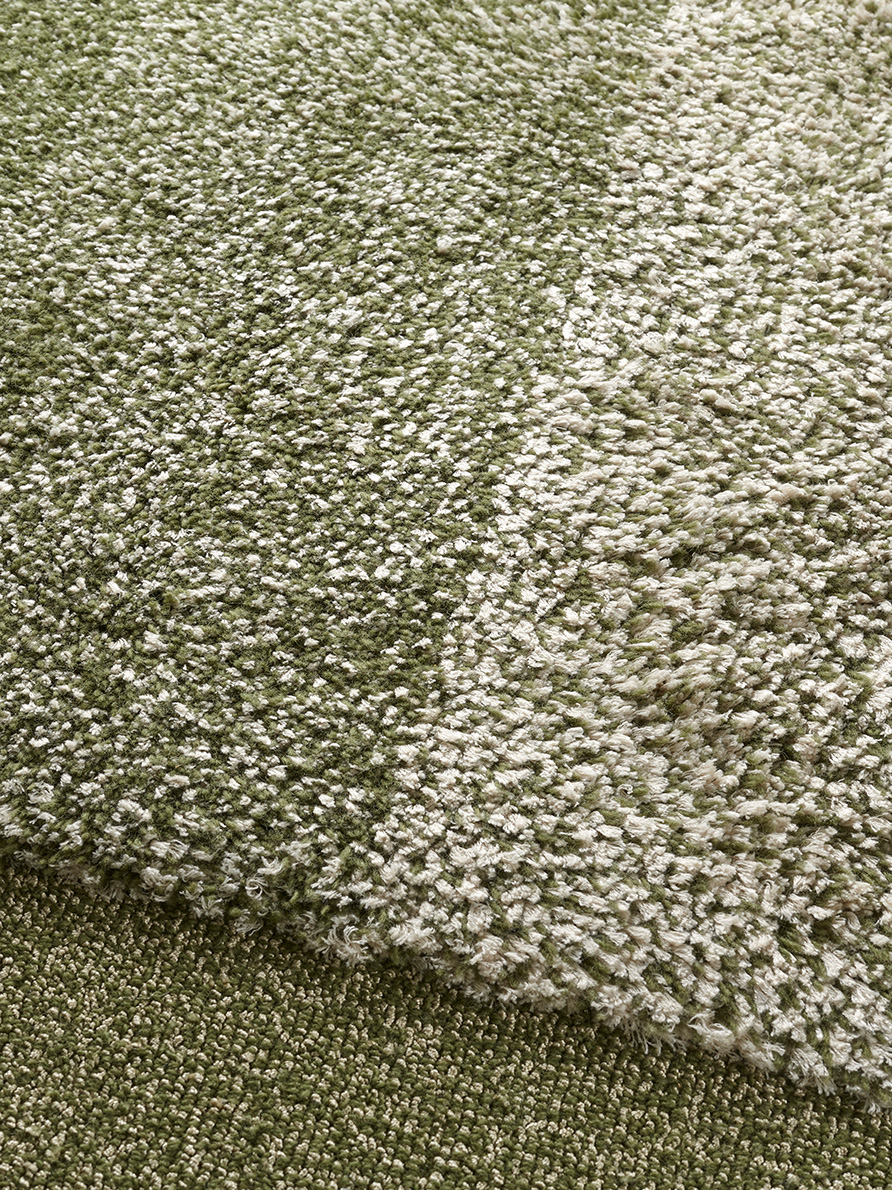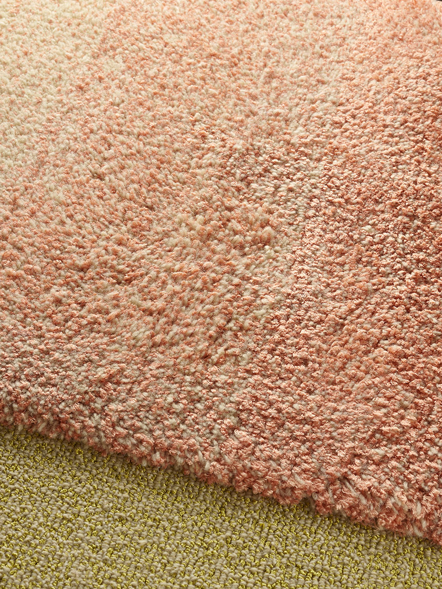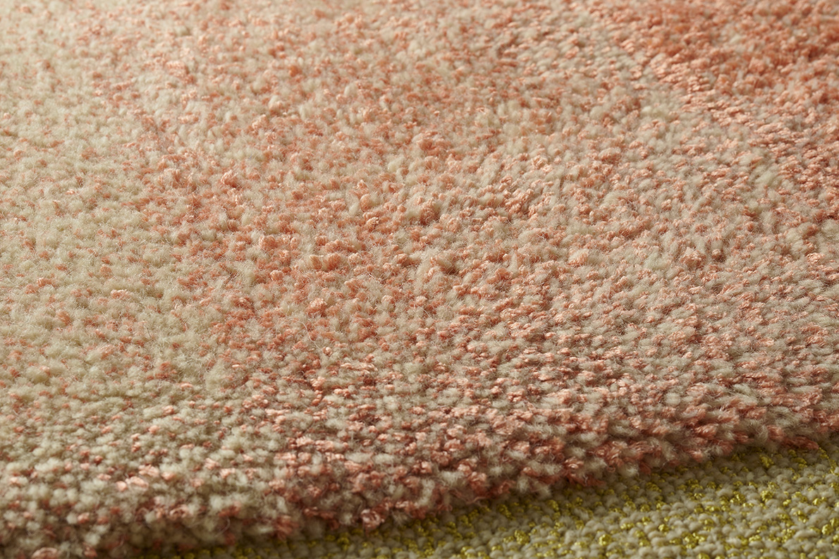 Pur jeu de matières et de chinés, ce tapis est avant tout une recherche d'équilibre entre les textures. Le velours coupé en haute-mèche en chiné laine de Nouvelle-Zélande et soie végétale est encadré par une boucle chinée très rase en laine et nylon brillant.