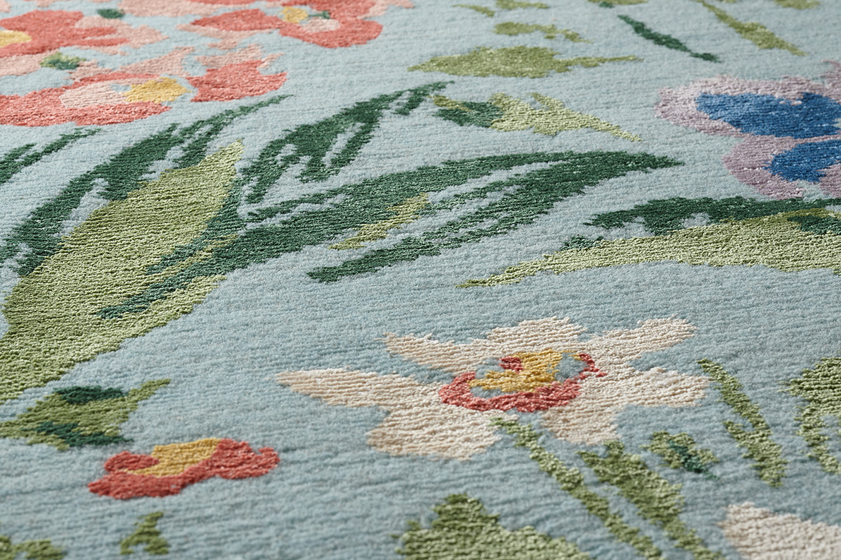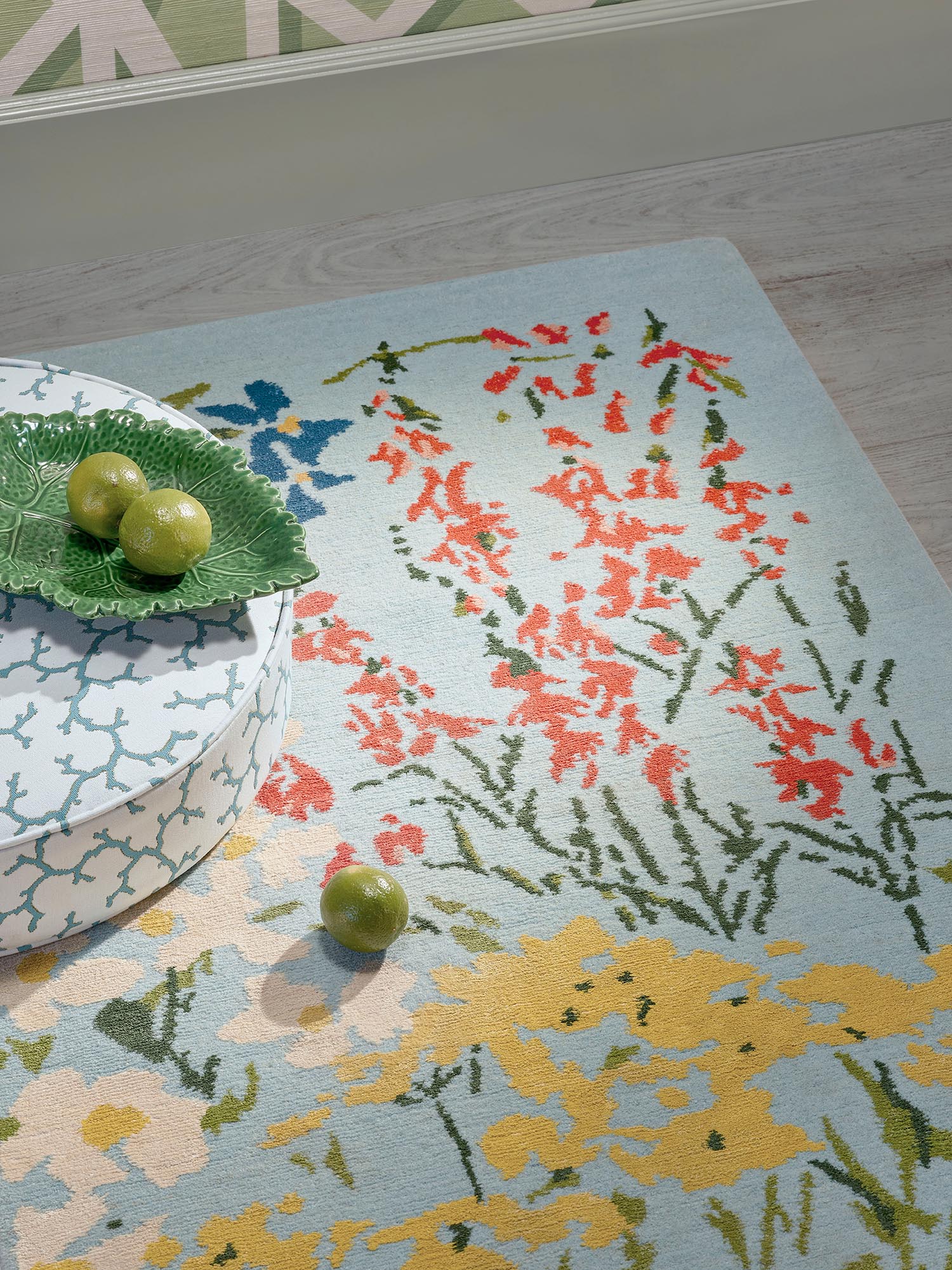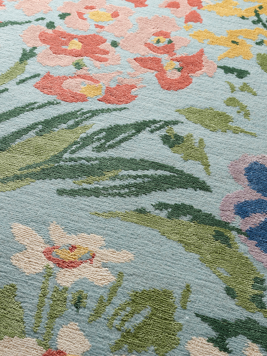 Un motif floral vintage aux couleurs rafraîchissantes évoquant les souvenirs du printemps. Entièrement noué à la main de façon traditionnelle au Népal, la laine et la soie donnent vie à la composition et ombragent les pétales des fleurs.