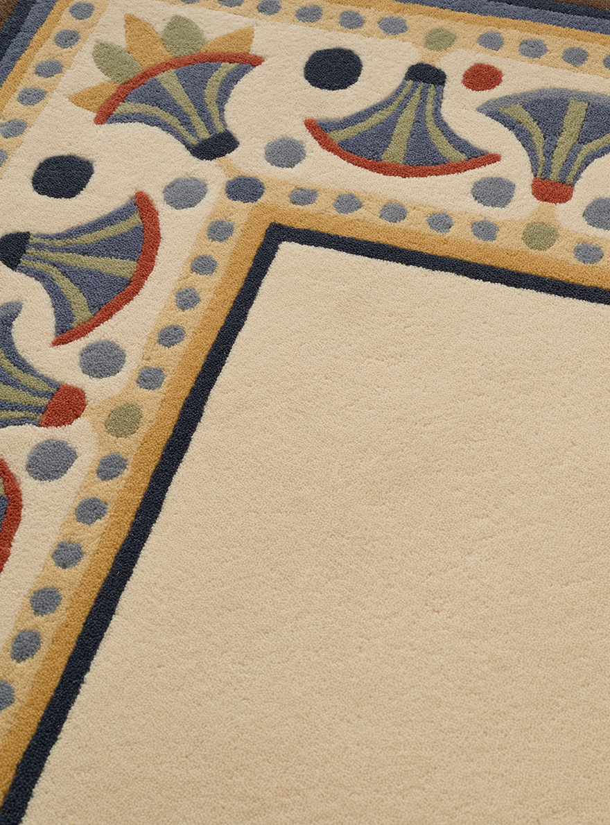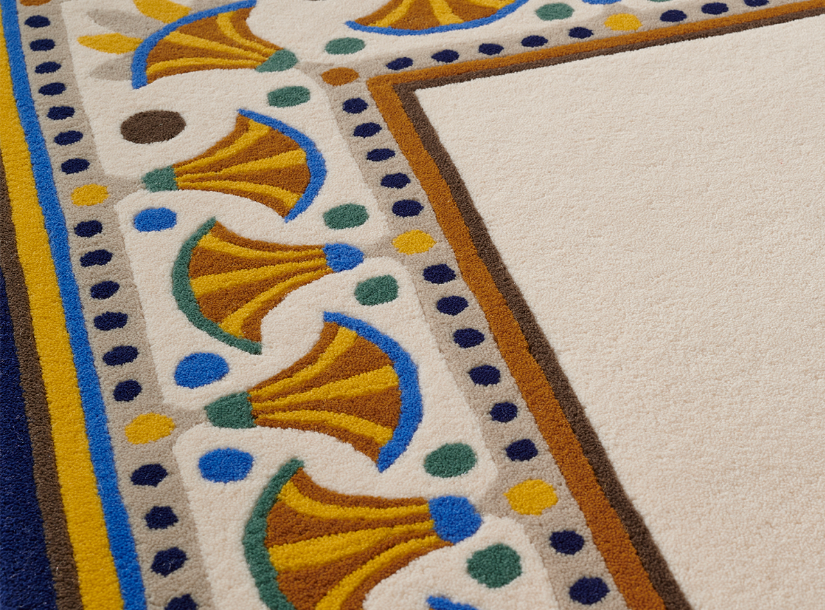 Hommage à la modernité décorative de l'Egypte des Pharaons, la bordure DJEDEFRE est directement inspirée par les recueils de l'égyptologue suisse Gustave Jequier. Tufté à la main, en laine de Nouvelle-Zélande.