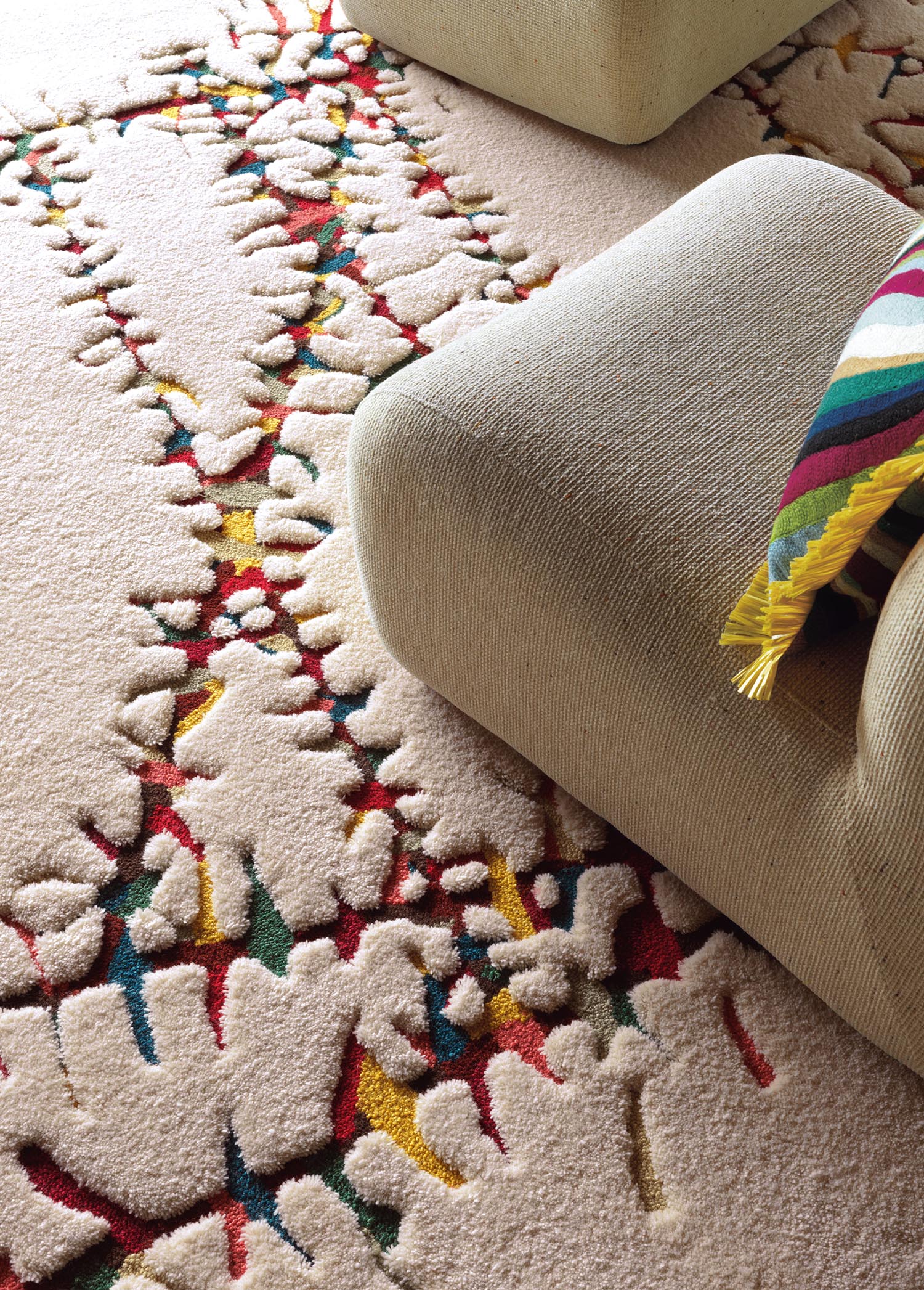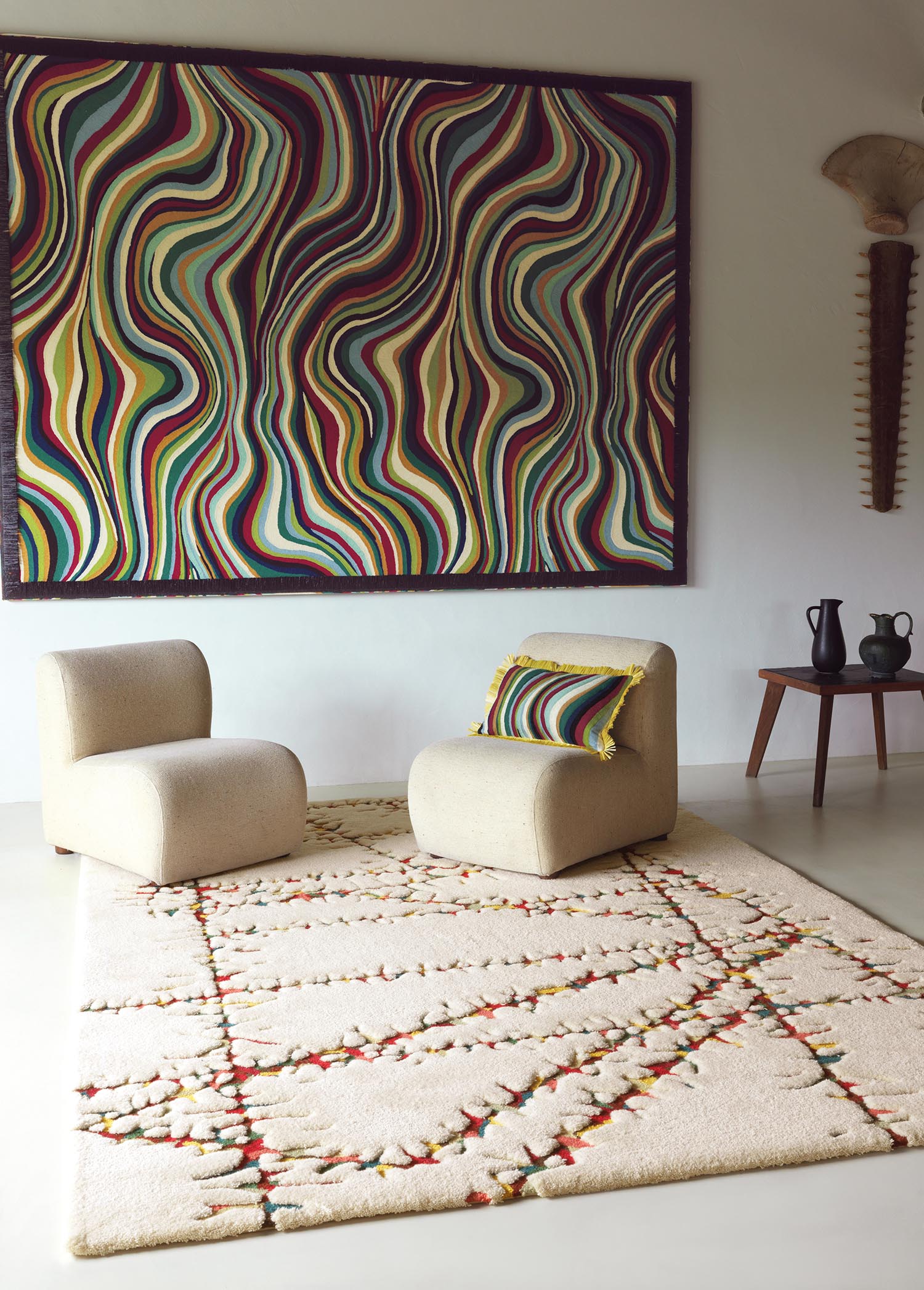 Les mattangs, aussi appelés Medosou ou Rebbelibs, étaient les cartes de navigation nautiques ancestrales en Polynésie, composées avec des bâtons de bois courbés montrant les courants marins et des coquillages représentants la position des îles. Le tapis MATTANG s’inspire librement de cet art en jouant sur les lignes et les points de couleurs. Il est composé d'un fond en velours de laine, et d'une bouclette mélangeant laine et bambou.