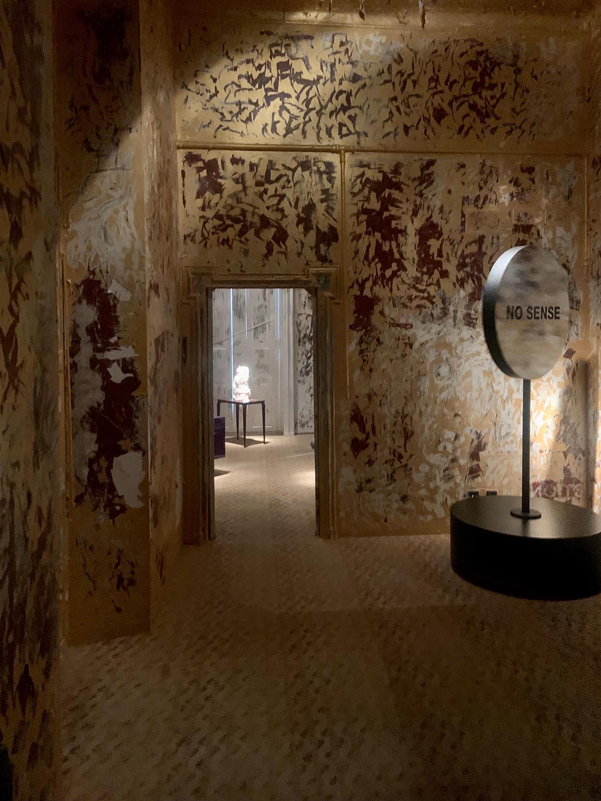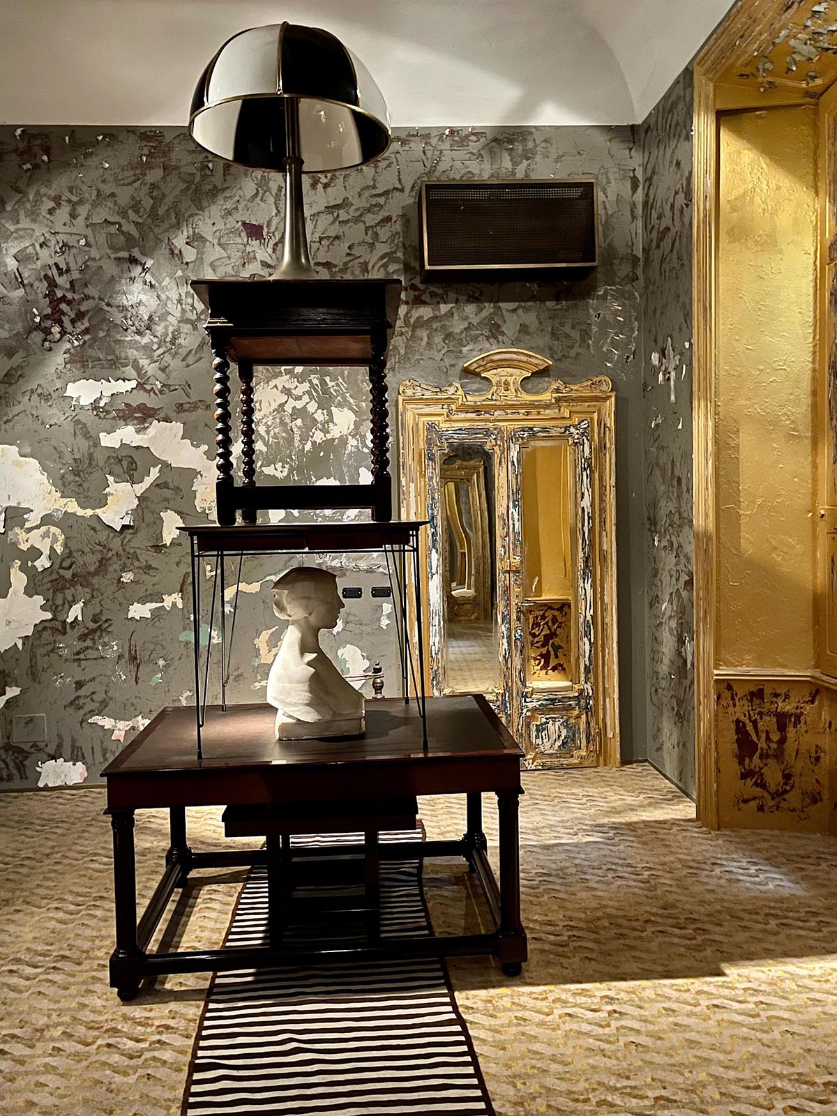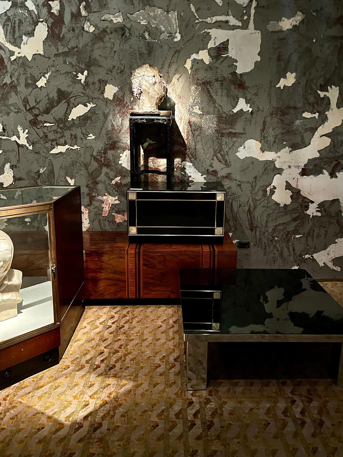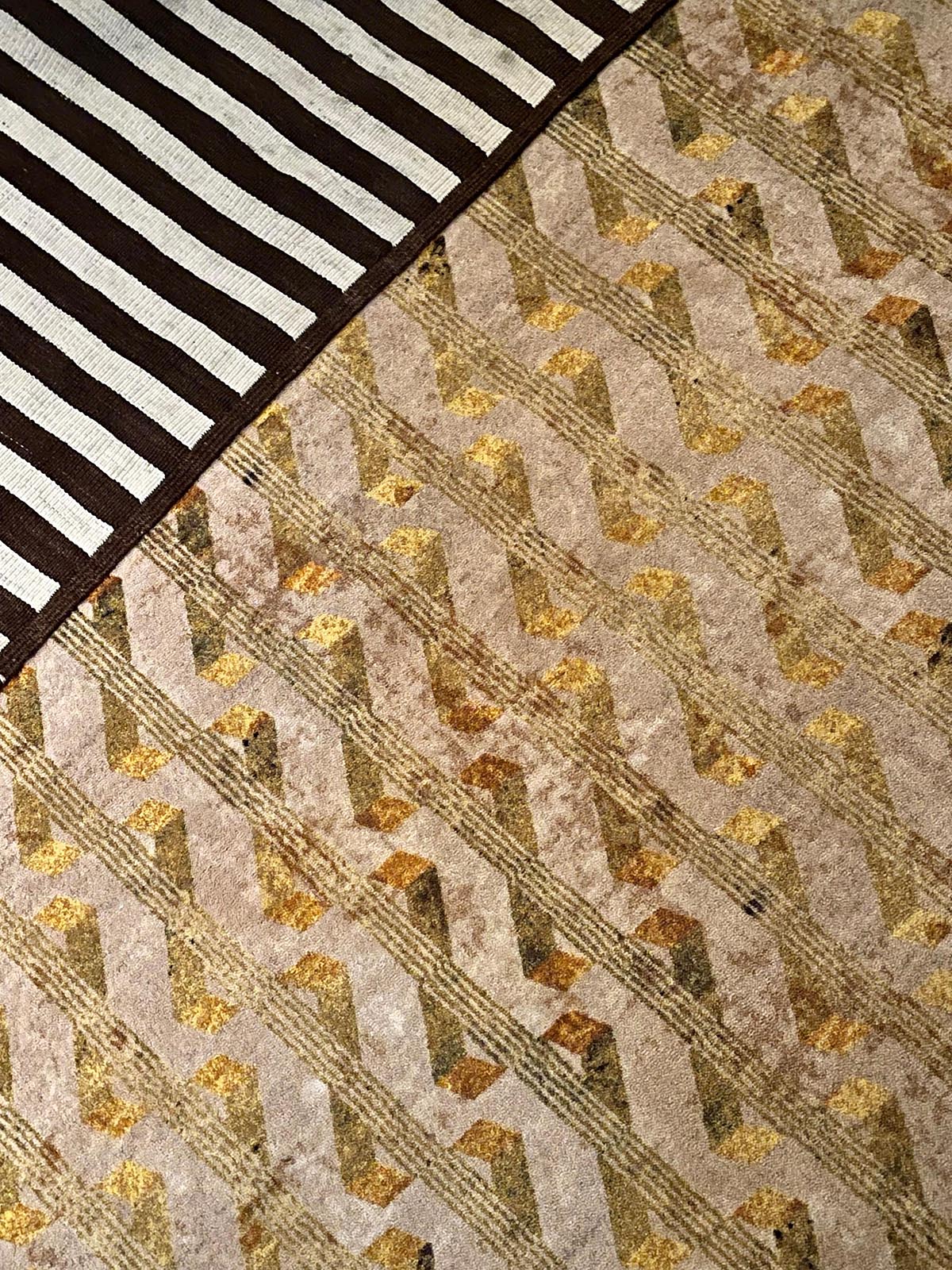 EMBLEM reprend le logo de Dimore Studio, imprimé en moquette grande largeur sur un velours de polyamide. Ce motif élégant se décline en deux variantes : la première en gris et or, la deuxième en chocolat noir et or. Cette moquette est adaptée aux usages intensifs et aux escaliers.
