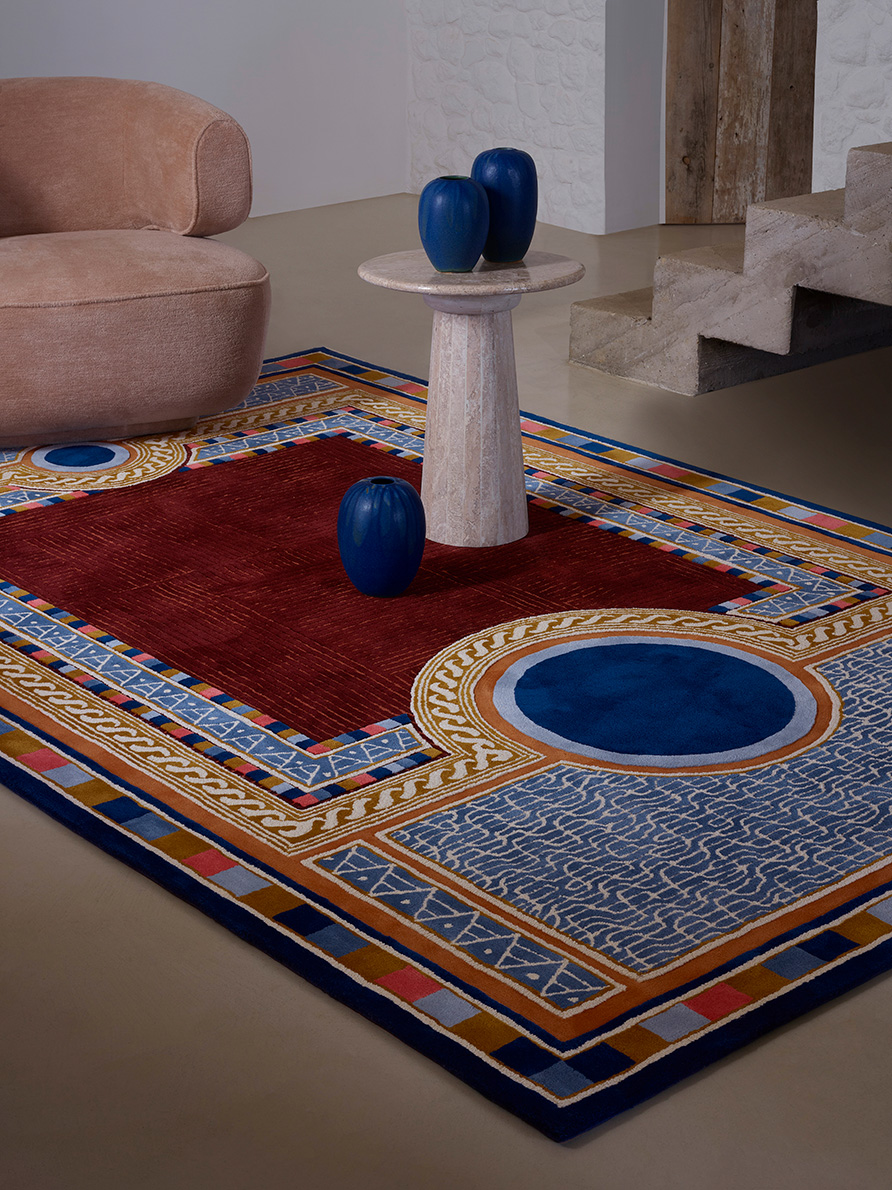 Tufté à la main, ce magnifique dessin est enrichi par un subtil jeu de texture mélant velours coupé et bouclettes de différentes hauteurs.