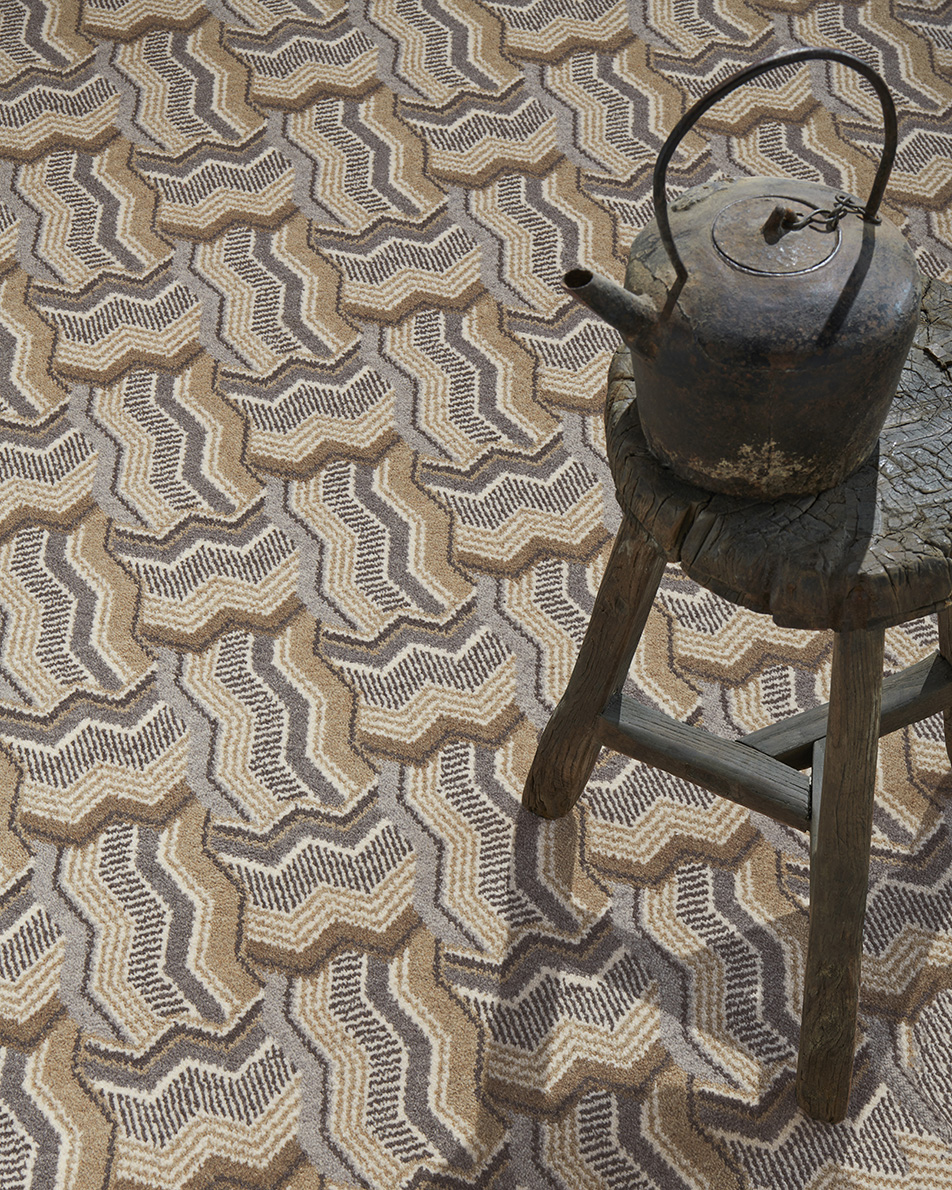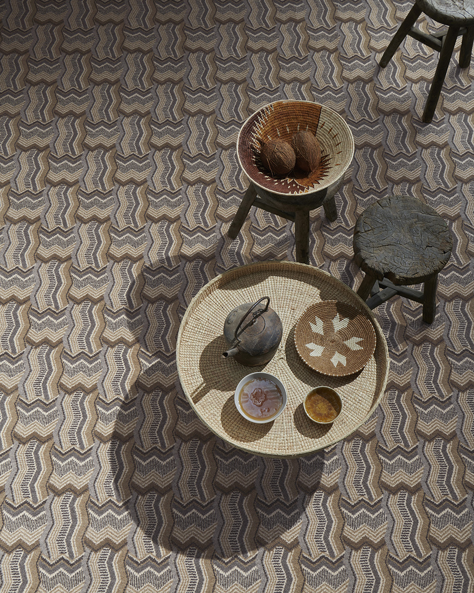 Ce motif géométrique s'inspire de l'art de la vannerie. Il se décline en deux variantes couleurs : naturelle et bleutée qui mettent toutes deux en avant la vibration du dessin.