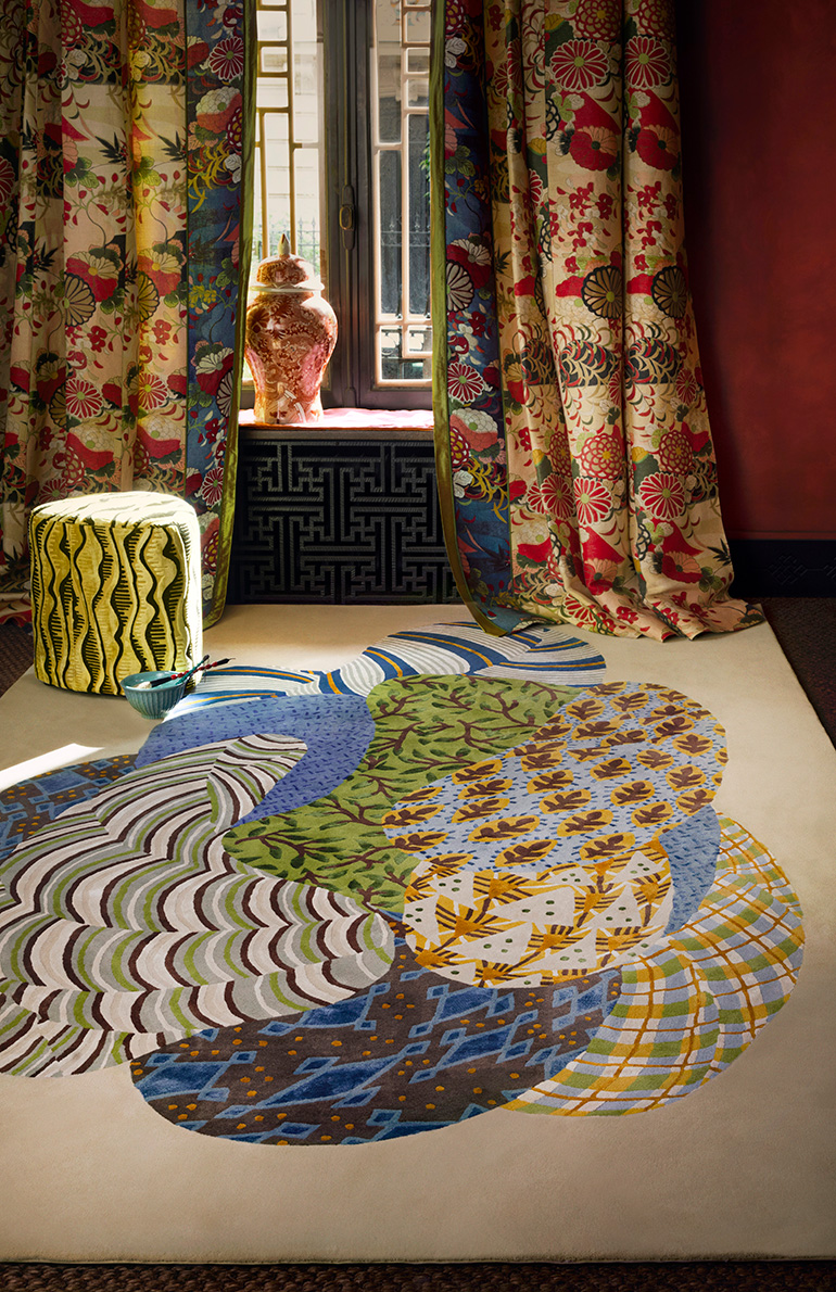 SOLEIL LEVANT ! Un nom comme une promesse d’ailleurs, la découverte d’un art millénaire, des paysages et un artisanat singulier : l’Extrême-Orient. Portée par l’esprit Wabi-Sabi, entre plénitude et trace de l’activité humaine, la collection revisite le bestiaire réel ou imaginaire de tigres ou dragons de ce territoire, les porcelaines chinoises, les techniques et les motifs des vêtements traditionnels japonais ou tibétains. Elle invite à l’évasion poétique au travers de jeux de textures, d’encres, de formes et de couleurs aux harmonies subtiles.