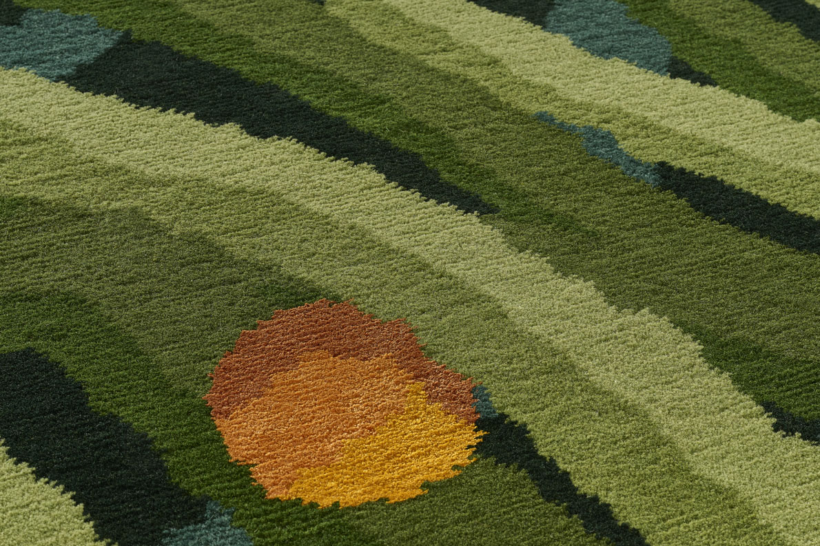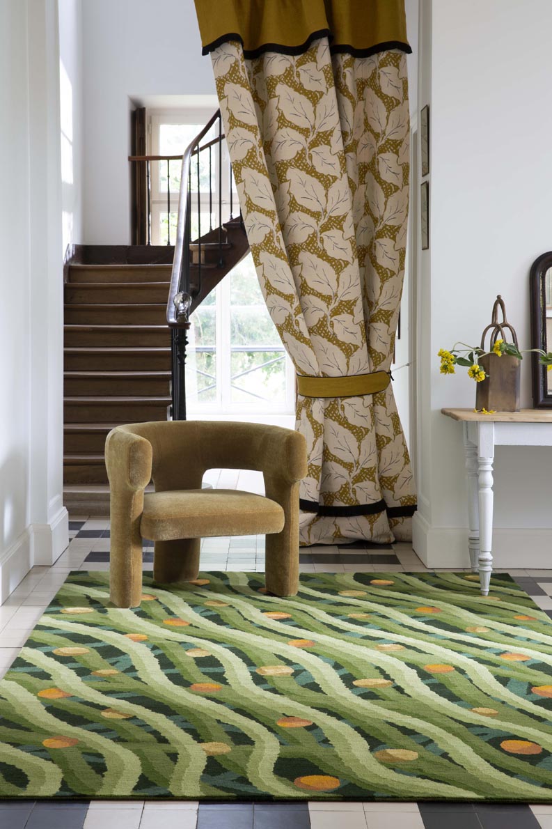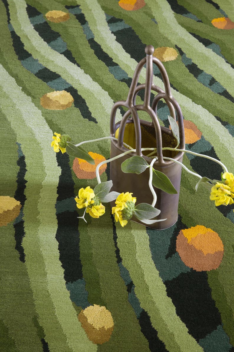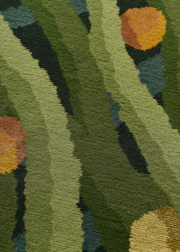 Inspiré d’un verger d’oranges et de citrons, ORANGERAIE est un magnifique tapis en noué-main népalais. Avec ses couleurs joyeuses et harmonieuses, il représente une verdure en velours de laine de l’Himalaya sur laquelle semblent danser des oranges et des citrons en velours de soie.