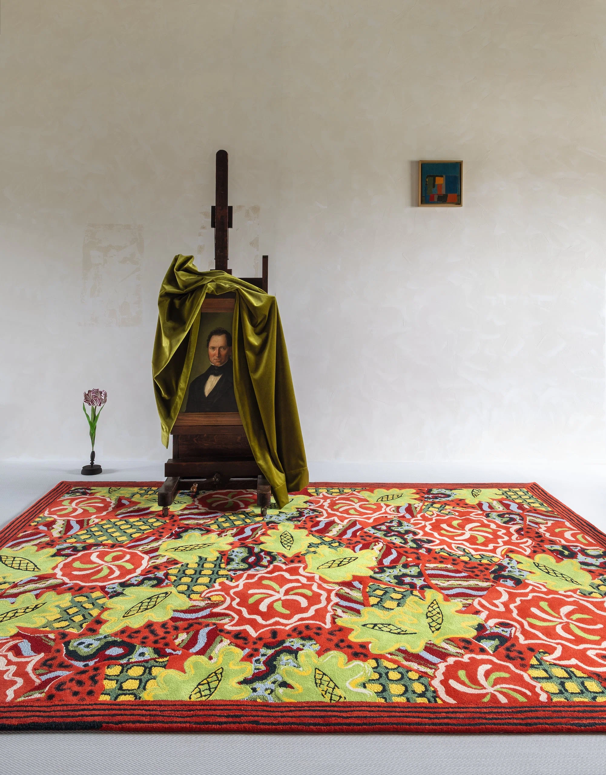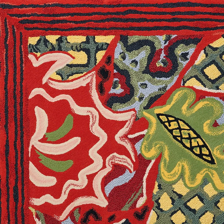 Coup de cœur du studio, cette magnifique œuvre a été retranscrite en tuft-main, alternant velours et bouclette en laine de Nouvelle-Zélande, usant de teintures aux couleurs vives et profondes.