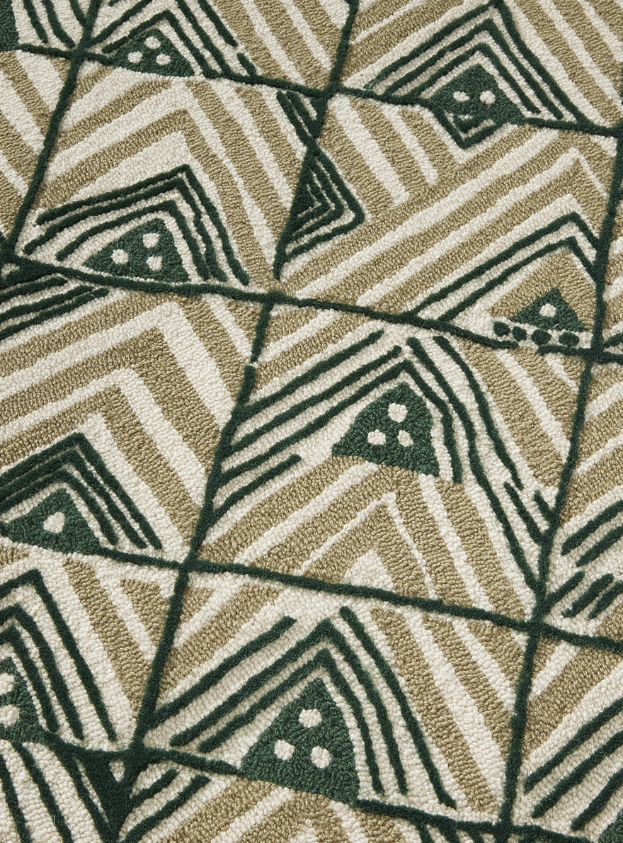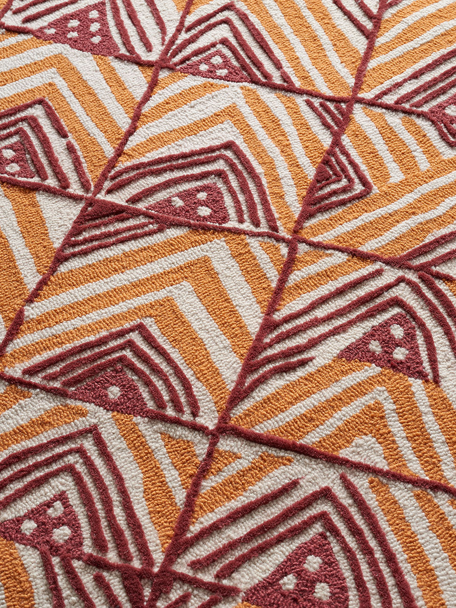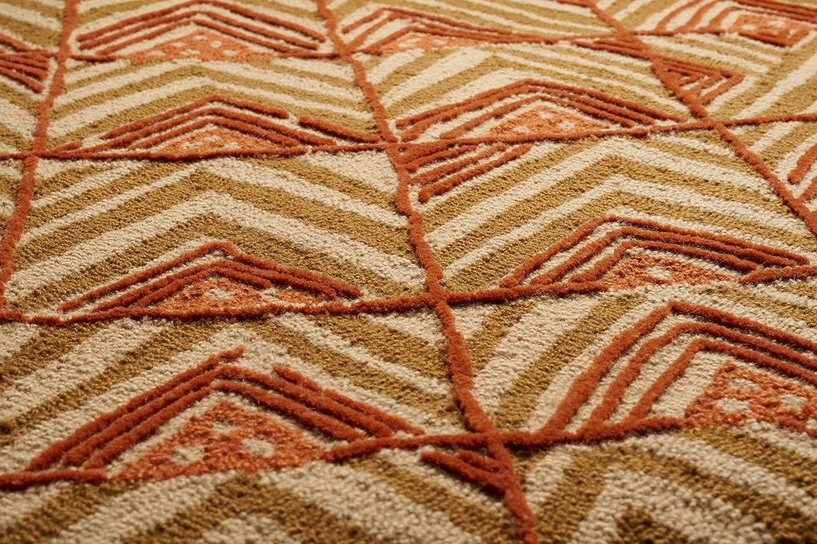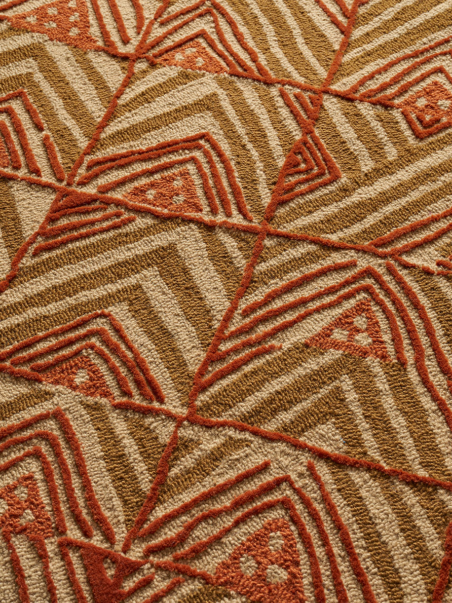 Ce dessin s'inscrit dans la grande tradition des dessins africains que Le Manach a édités dès 1928 par la reproduction d'un motif que l'on retrouve communément sur les velours Kuba du Congo. Tufté à la main avec une jolie texture de bouclettes et de velours coupé de laine de Nouvelle-Zélande.