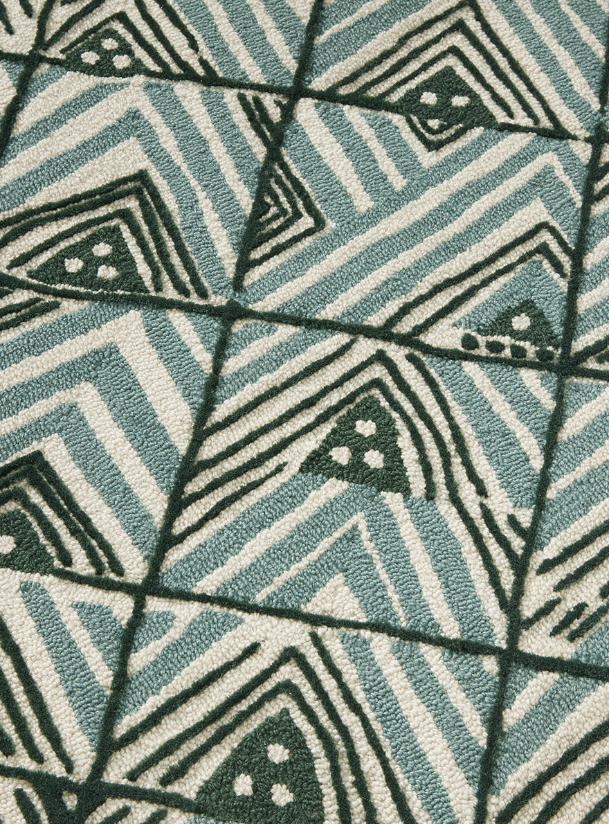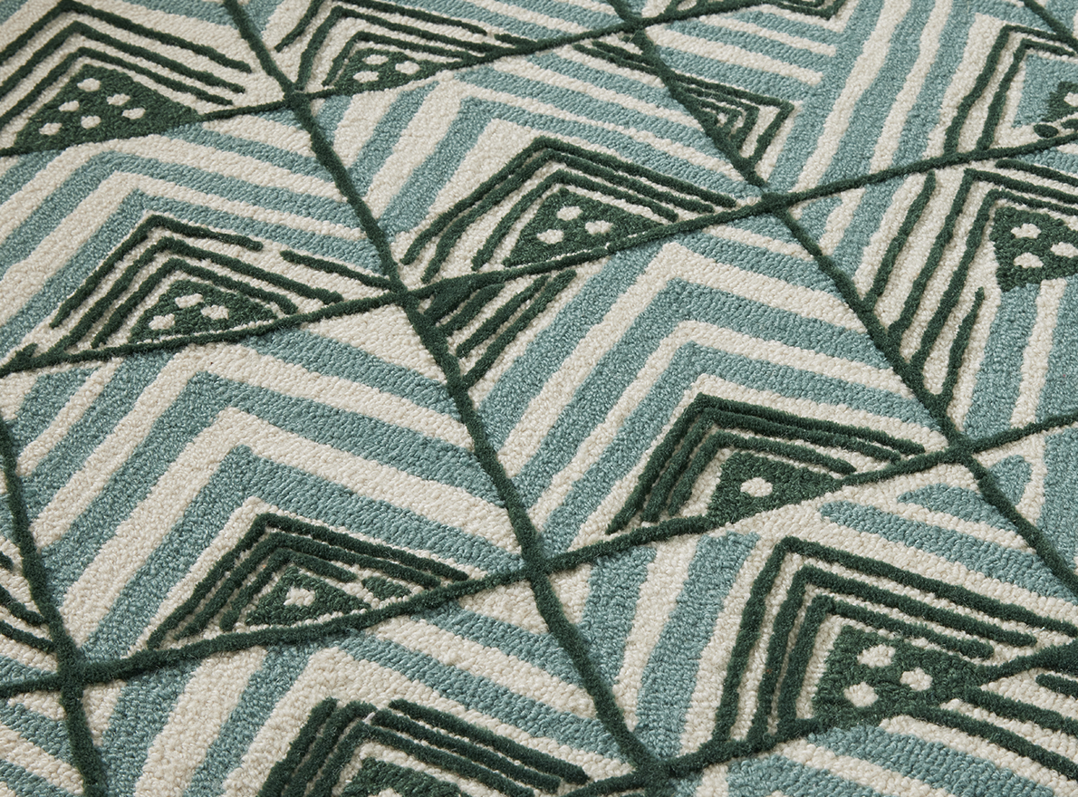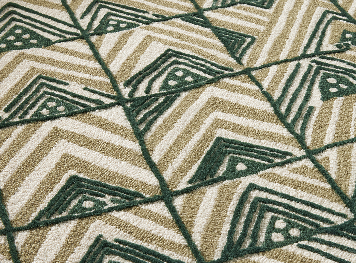 Ce dessin s'inscrit dans la grande tradition des dessins africains que Le Manach a édités dès 1928 par la reproduction d'un motif que l'on retrouve communément sur les velours Kuba du Congo. Tufté à la main avec une jolie texture de bouclettes et de velours coupé de laine de Nouvelle-Zélande.