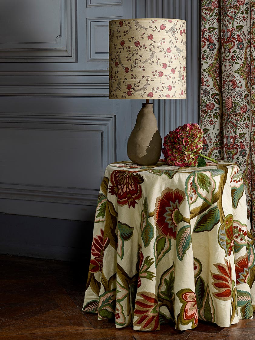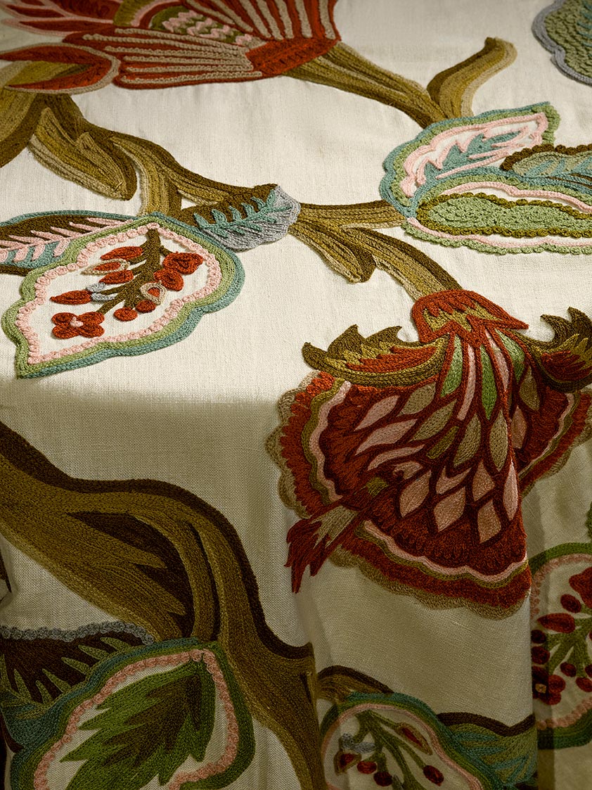 Grand arbre de vie brodé sur lin, ASHOKA évoque un paradis perdu abondant de fleurs et de feuillages extraordinaires. La richesse de ses points de broderie main et sa coloration tout en nuances lui confèrent un caractère précieux et rare.