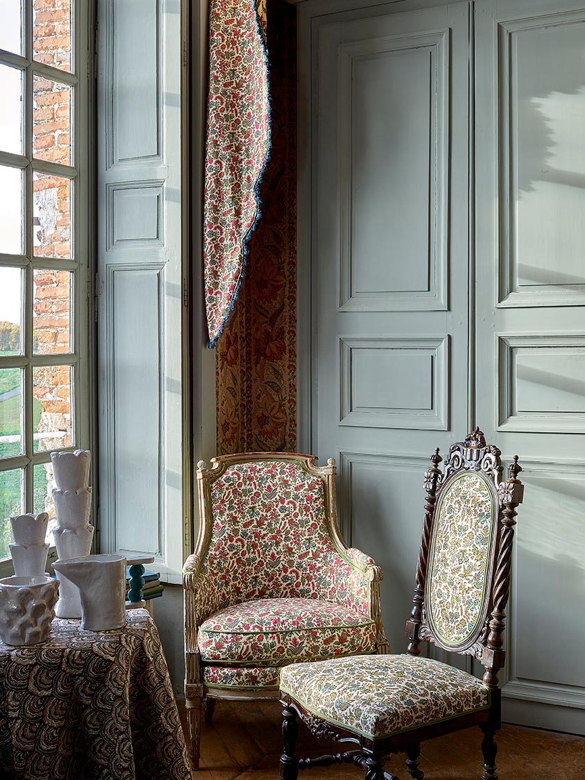 Large motif d’écailles reprenant le détail de la base d’un Kalemkar issu des archives de la Maison, FLEURY est un remarquable jacquard par sa très belle trame de lin et ses croisements de fils permettant des jeux de colorations subtils. Ses teintes douces se coordonnent parfaitement aux autres étoffes de la collection Braquenié.