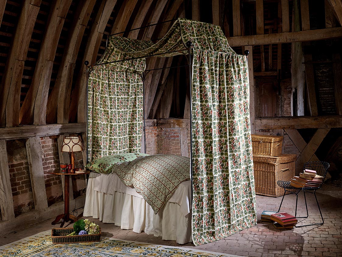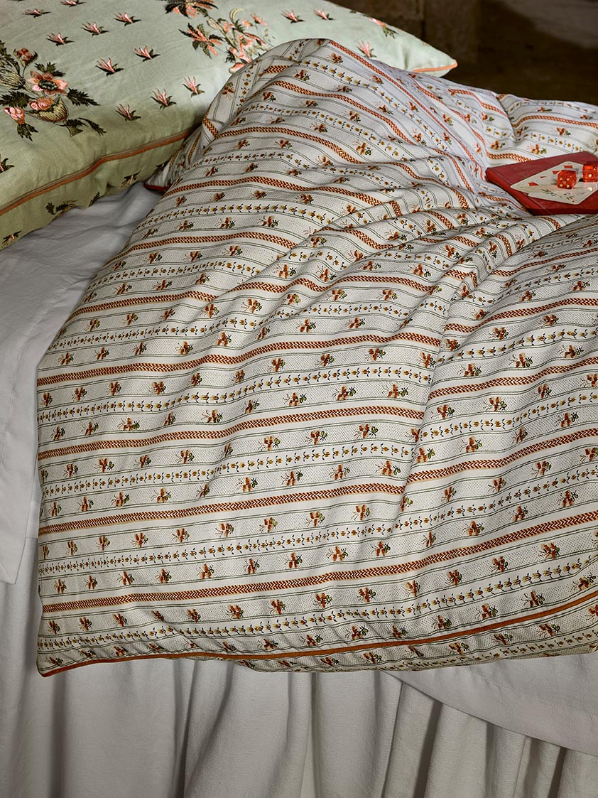 Cette charmante rayure florale est typique des imprimés du XVIIIe siècle imitant les chinés à la branche. Le textile original, imprimé à la planche de bois à la fin du XVIIIe siècle, conservé dans le fonds patrimonial de la Maison, était destiné à la mode. Elle est déclinée dans des teintes chaleureuses et intemporelles.