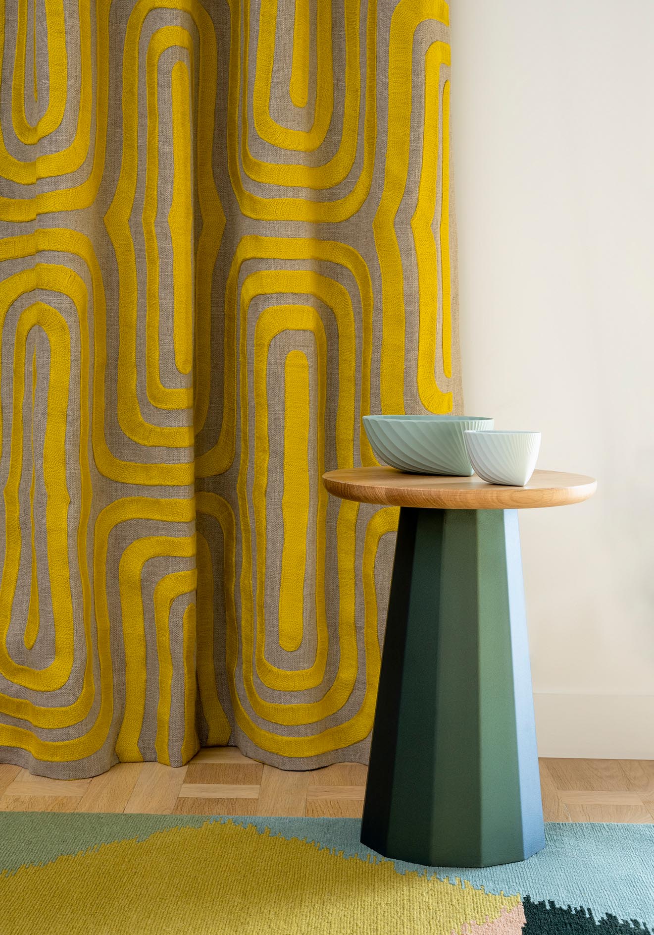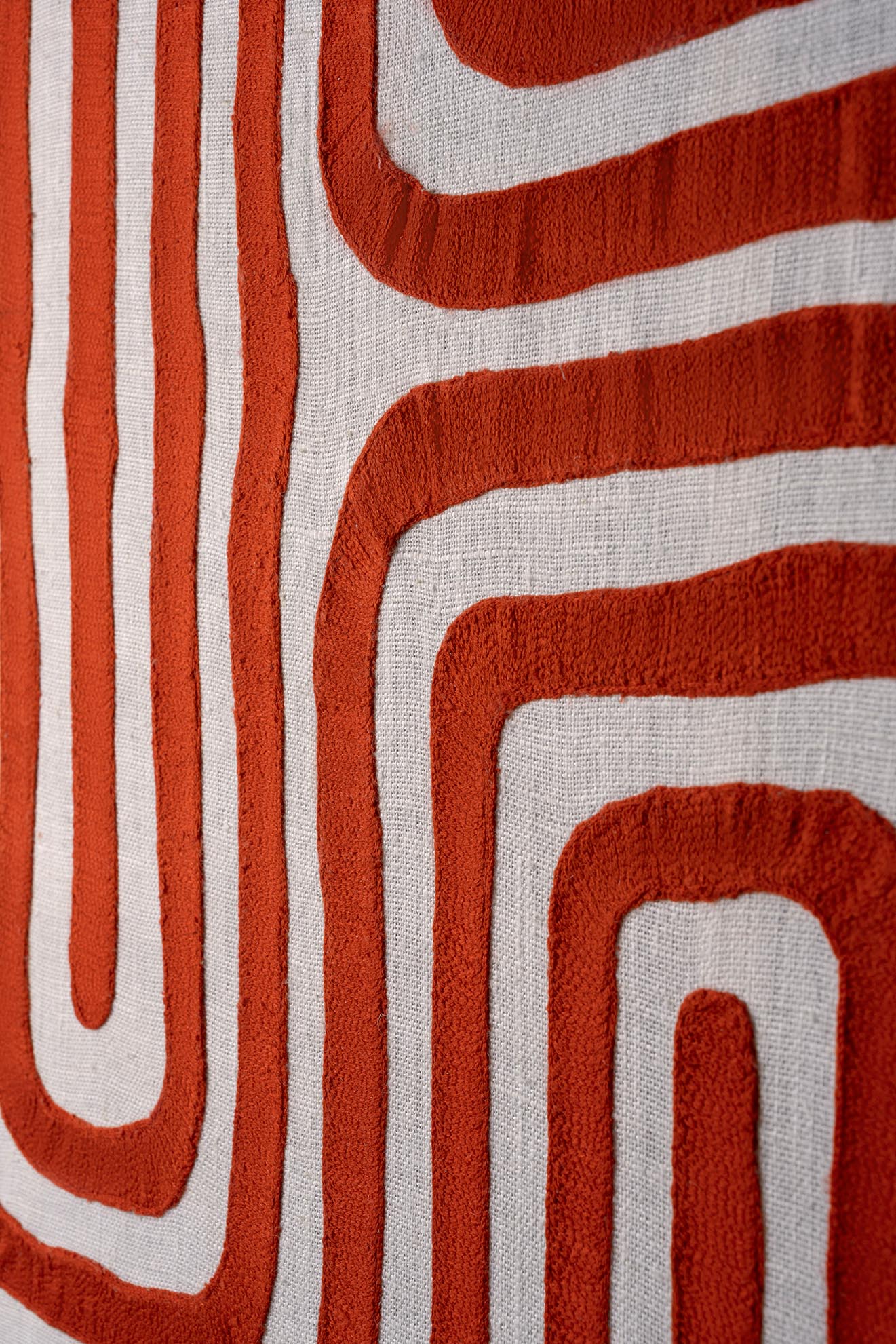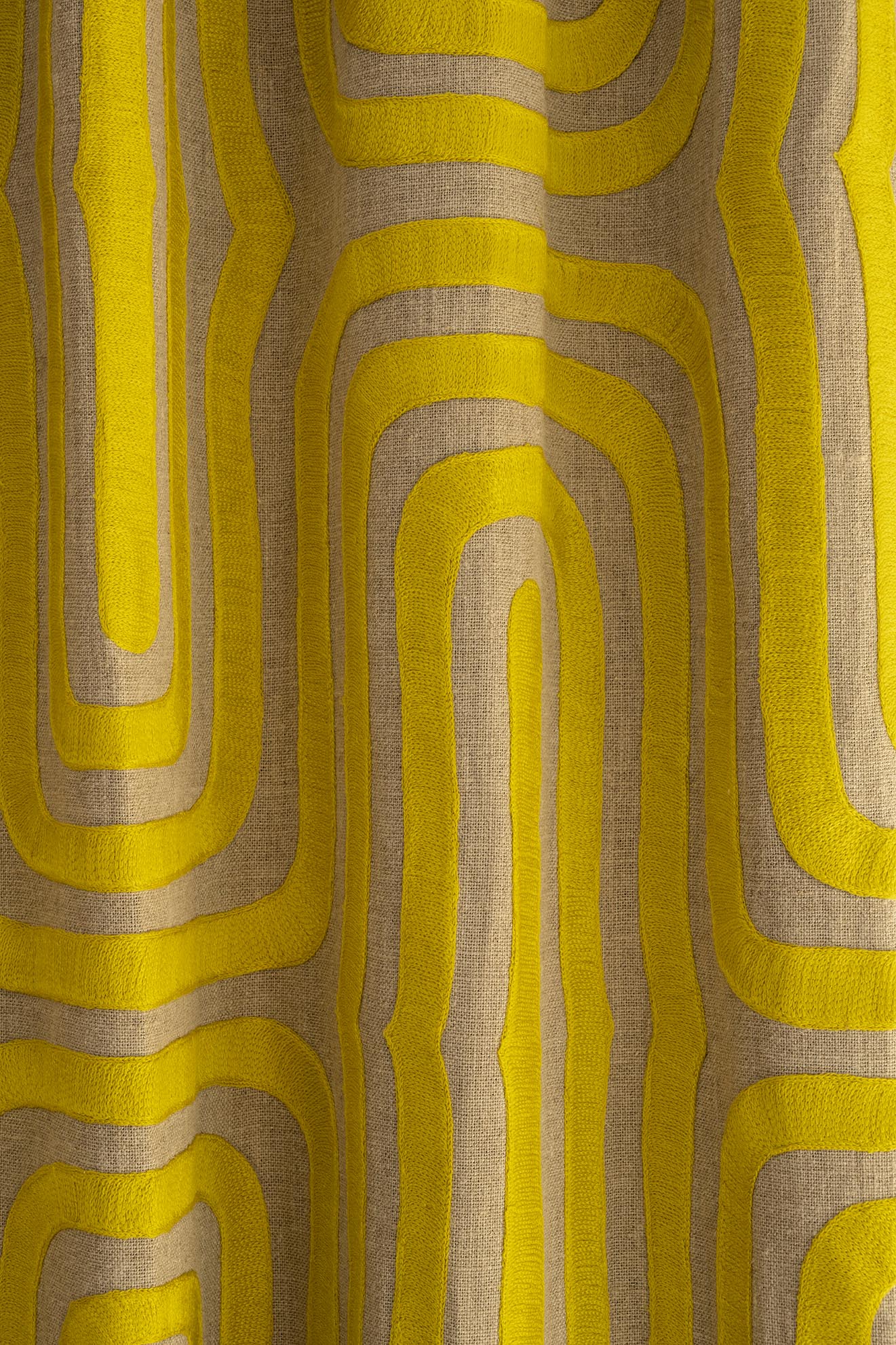 Modulation d'une ligne continue, mouvement régulier d'une couleur lumineuse brodée sur lin qui se déroule avec élégance.