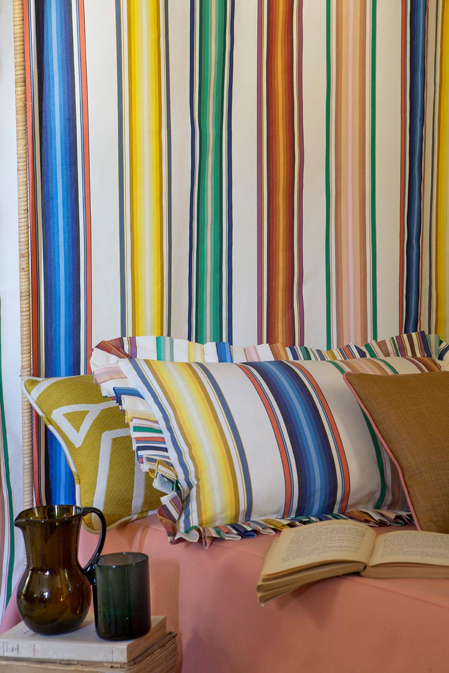Inspiré d'un document issu des archives de la Maison Pierre Frey, BAIN DE SOLEIL réinterprète la toile rayée que les traversées transatlantiques ont rendu incontournable. Sa coloration gaie obtenue par l'ourdissage à disposition de sa chaîne fait écho à la diffraction de la lumière décomposée en raies colorées.