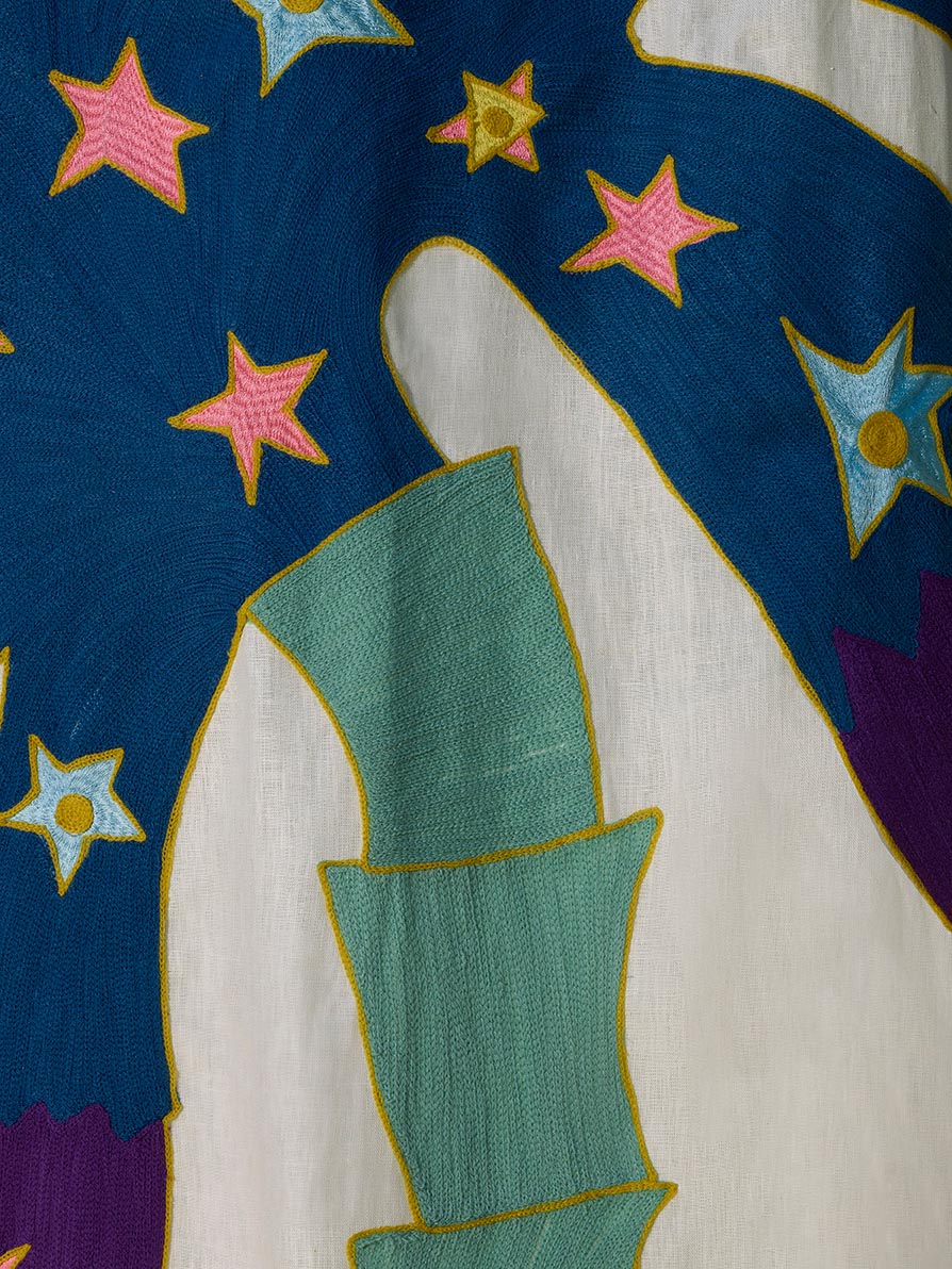 Comme dans un rêve, ce palmier majestueux fleurit d étoiles se pare des plus délicates broderies. Ce panneau entièrement brodé sur lin, haut de 3 mètr...