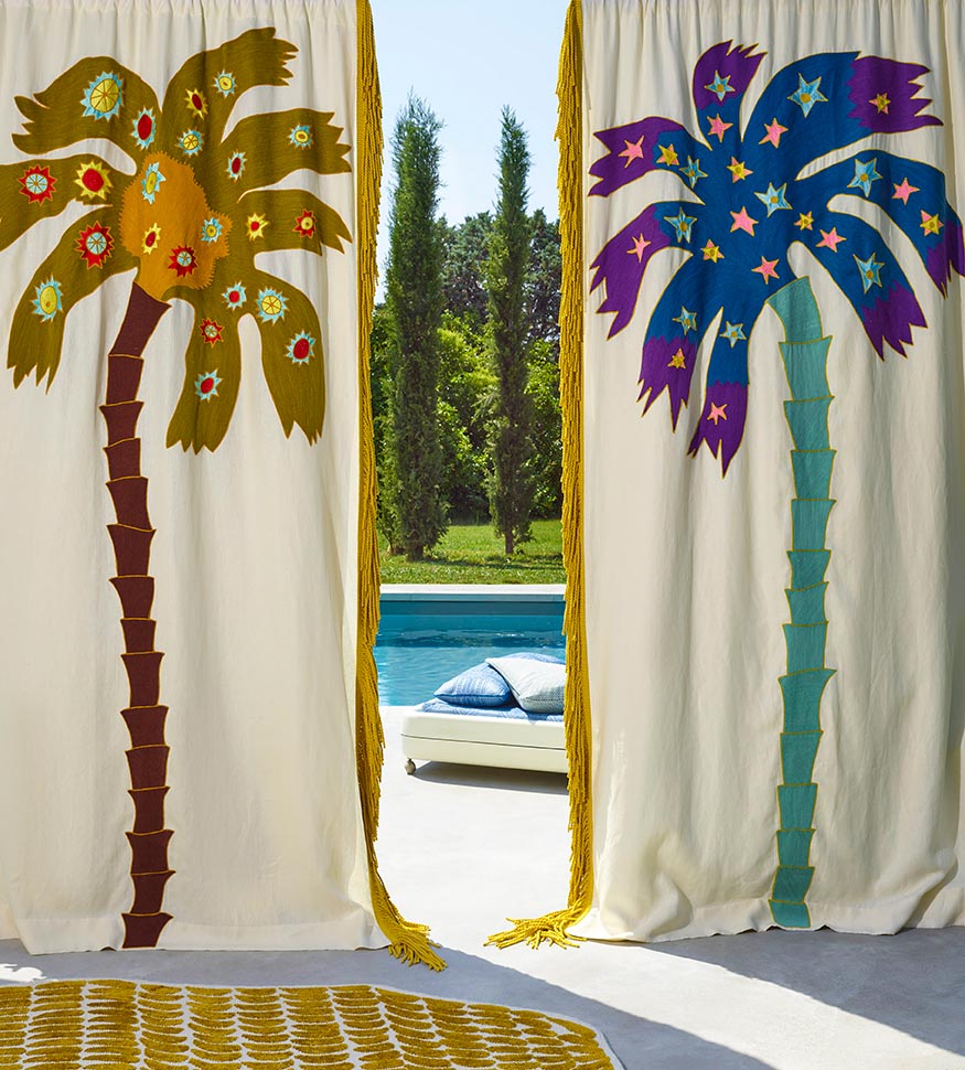 Comme dans un rêve, ce palmier majestueux fleurit d étoiles se pare des plus délicates broderies. Ce panneau entièrement brodé sur lin, haut de 3 mètres, constitue une paire avec la référence F3563 LES PALMES D ALMA I (001 JOUR). Dessin réalisé par Alma âgée de 11 ans. 10% des bénéfices sont reversés à la Fondation de France, pour soutenir le projet " Tous unis contre le virus " via une action menée pour lutter contre le décrochage scolaire des enfants.