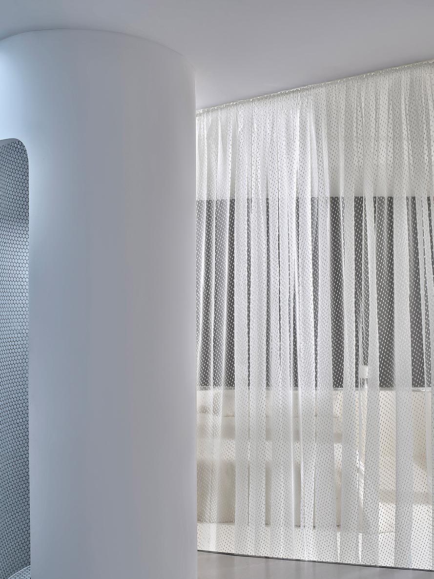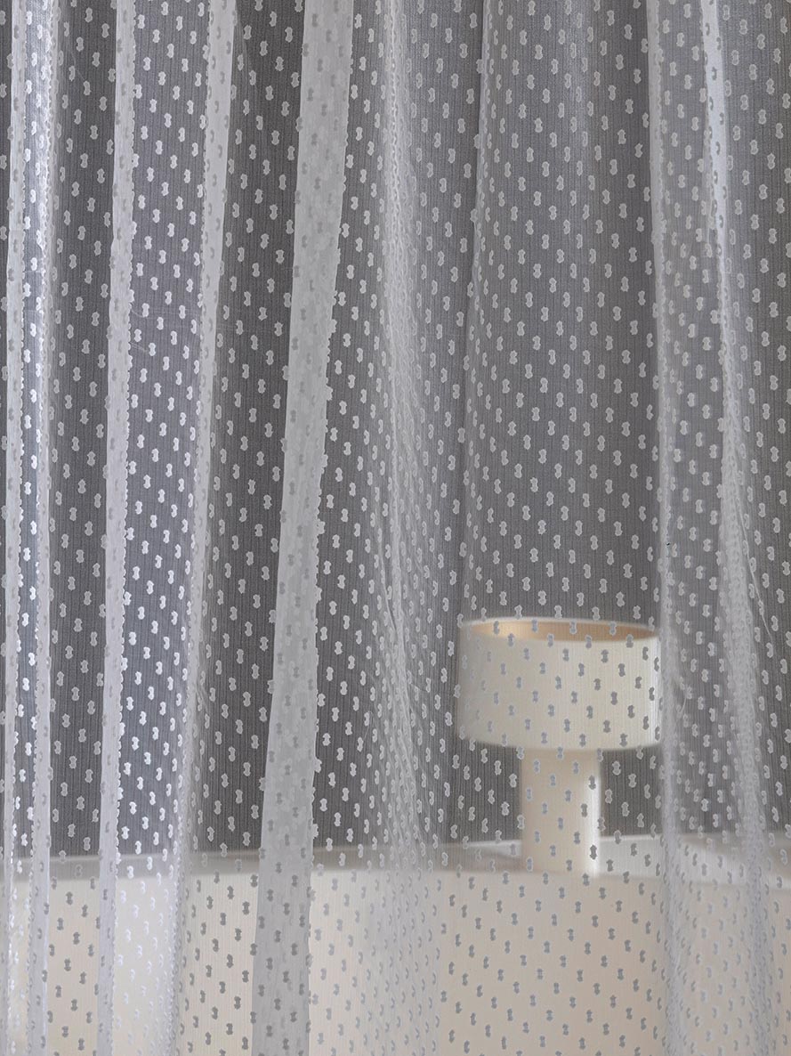 ECRINS est un voile délicat et féminin dont le contraste entre le fond translucide et le relief plumetis effet coton est un clin d'œil aux grands classiques du tissage. Tissé en grande largeur, il est très facile d'utilisation, non feu et lavable. Fibre polyester.
