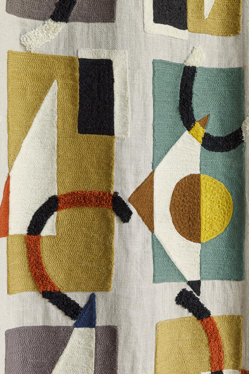 Sublime broderie évoquant avec force les jeux graphiques et colorés des œuvres constructivistes, tout en relief et jeux de matières, sur une base de lin lourd.
