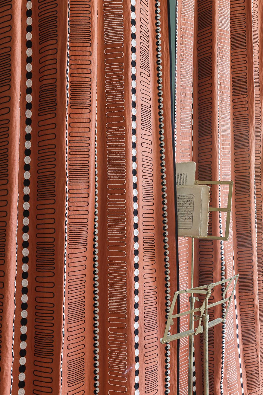Broderie graphique sur lin, le motif de FUNAMBULE évoque avec légèreté un rêve de chorégraphie rythmée.