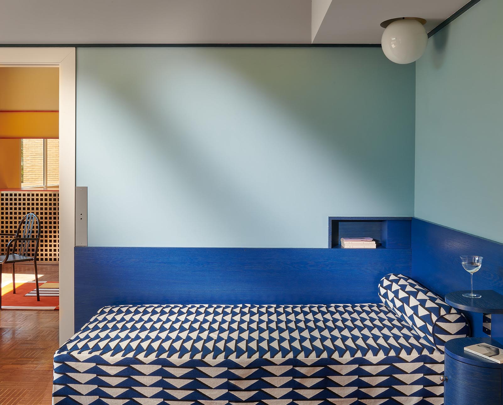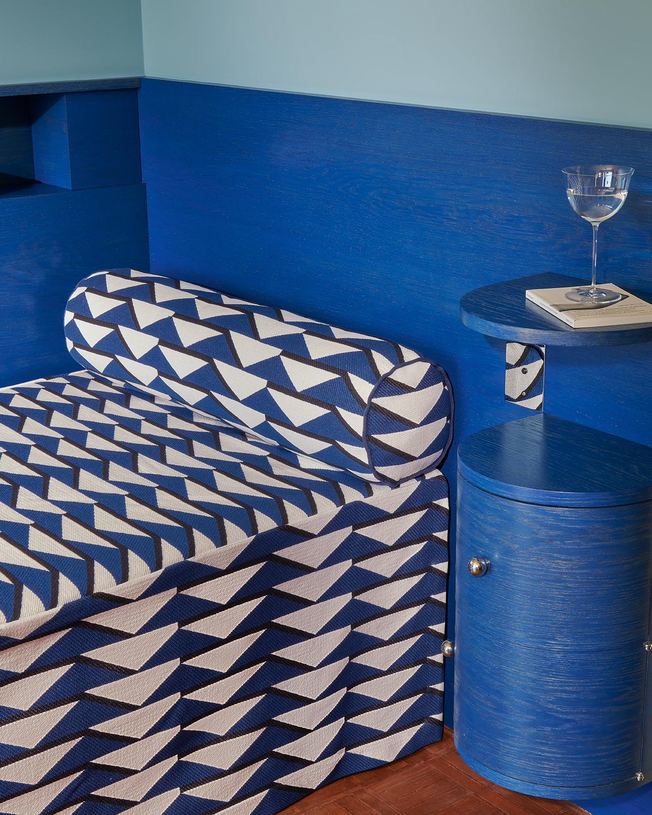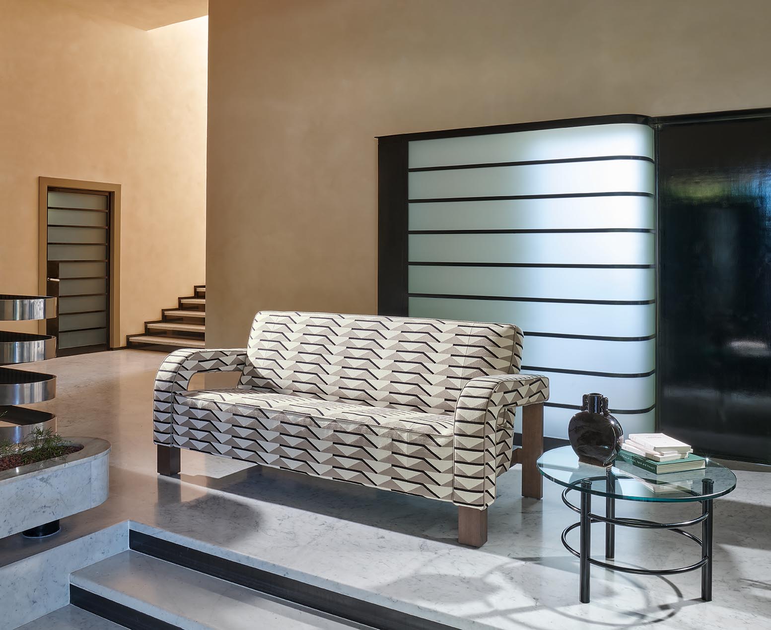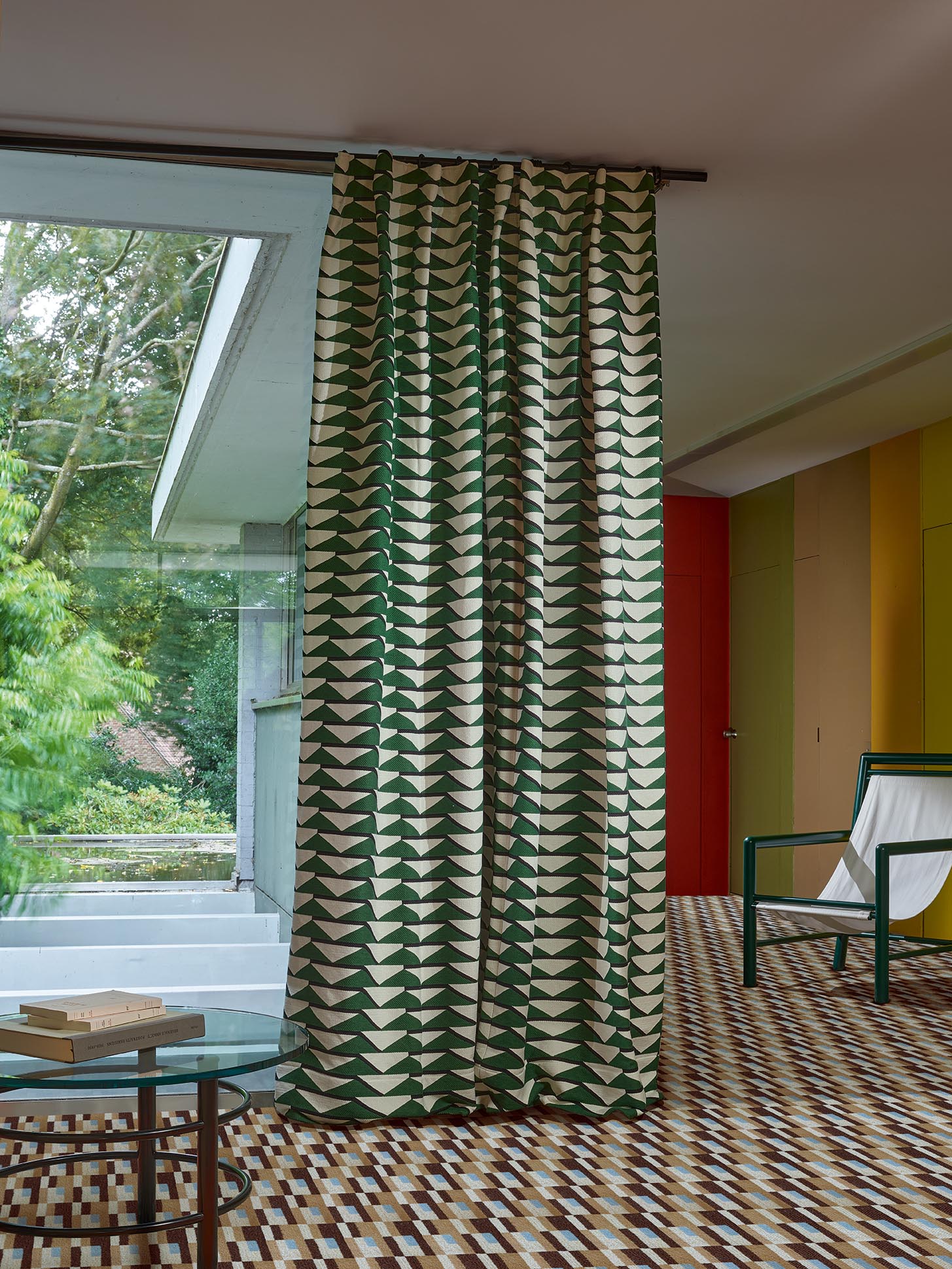 Intemporel, ce jacquard géométrique est une réinterprétation d’un dessin moderniste de la créatrice textile Elise Djo-Bourgeois imaginé en 1930 et présenté la même année sur le stand Djo-Bourgeois au Salon des artistes décorateurs à Paris. Les aplats de couleurs sont marqués d’une fine trame bouclée, renforçant par sa texture le relief induit de cette composition graphique. Tissé dans les ateliers Pierre Frey du nord de la France.