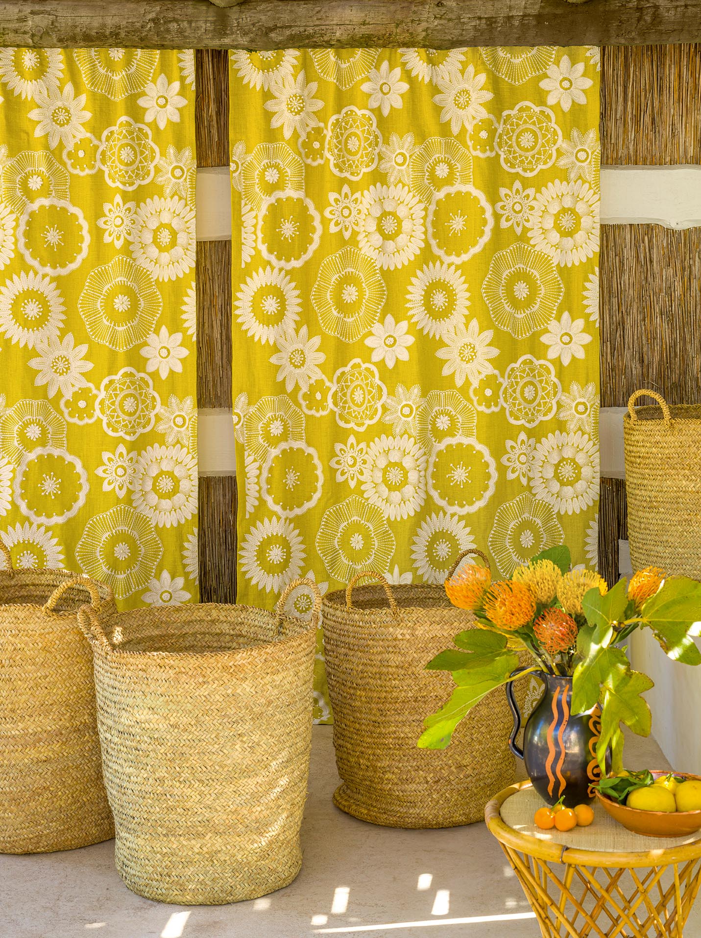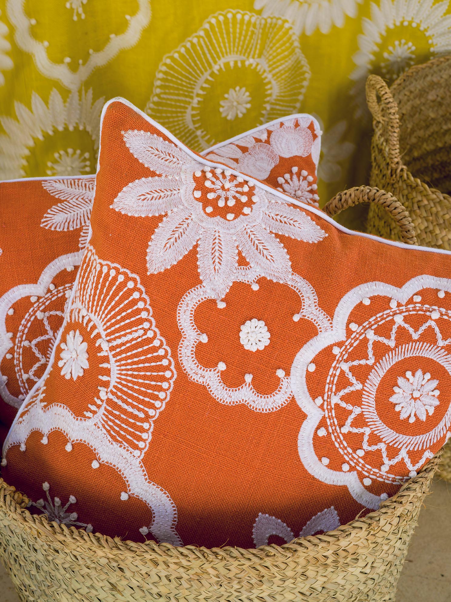 Comme des soleils, ces rosaces brodées en partie à la main, tourbillonnent sur une très belle toile de lin aux couleurs joyeuses.