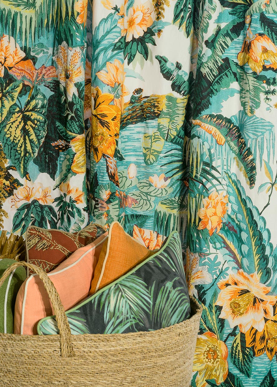 Ce fabuleux dessin issu des archives de la Maison Pierre Frey daté des années 1950 est imprimé sur lin et décliné dans des coloris éclatants illustrant la nature sauvage, les fleurs exotiques et les eaux du lagon. Existe également en papier peint.