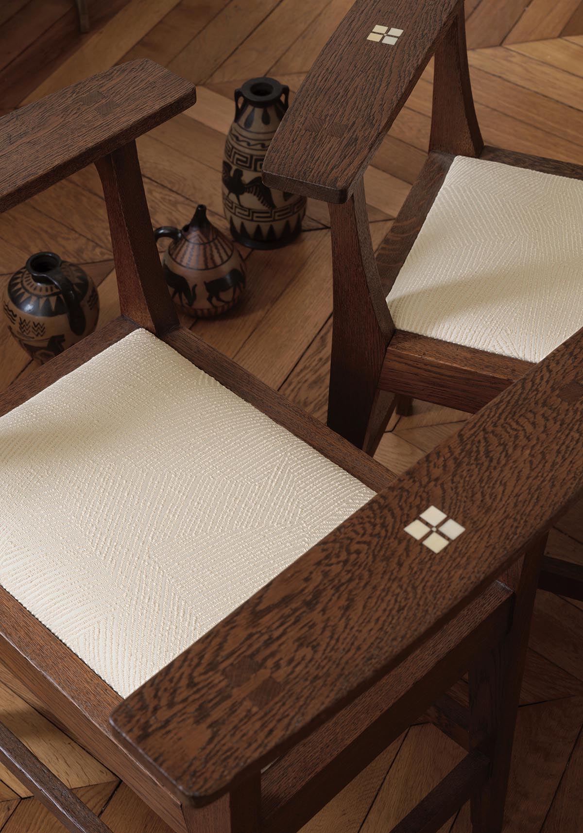 Avec son grand dessin à la géométrie variable, l’irrégularité de sa trame laineuse et la sophistication de son fond en satin de coton, ZAE est idéal en utilisation siège ou rideau.