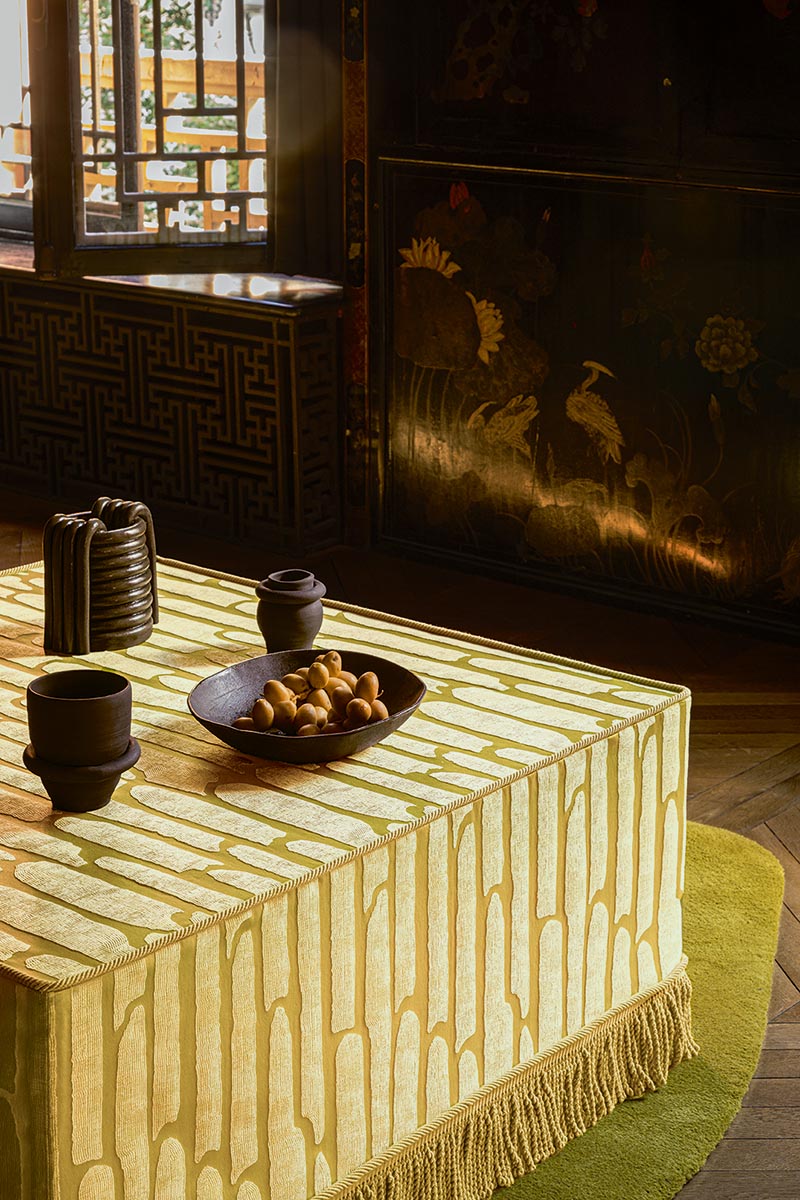 Dans une représentation minimaliste du jardin Zen, ce jacquard soyeux aux lignes sinueuses incite à la relaxation.