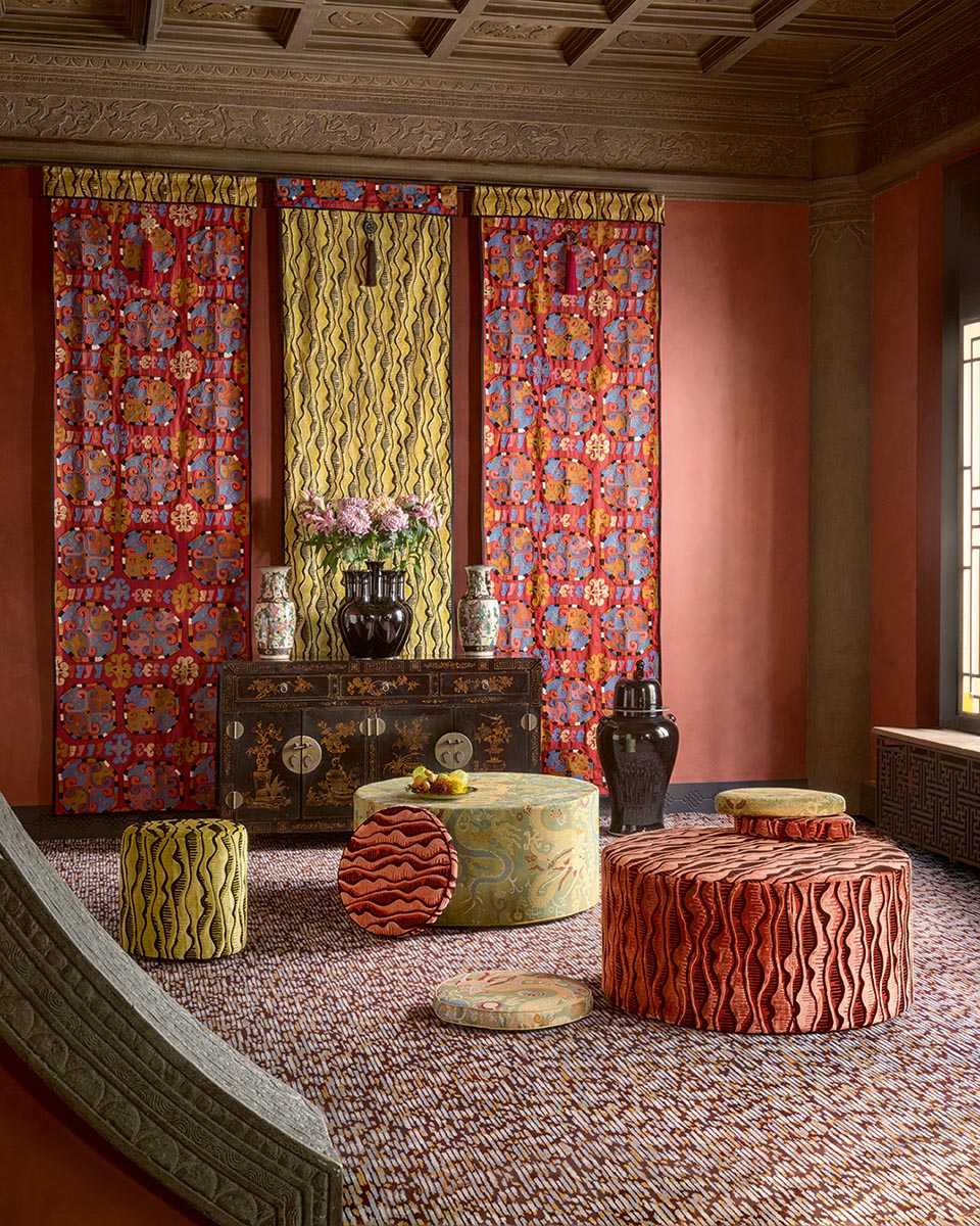SOLEIL LEVANT ! Un nom comme une promesse d’ailleurs, la découverte d’un art millénaire, des paysages et un artisanat singulier : l’Extrême-Orient. Portée par l’esprit Wabi-Sabi, entre plénitude et trace de l’activité humaine, la collection revisite le bestiaire réel ou imaginaire de tigres ou dragons de ce territoire, les porcelaines chinoises, les techniques et les motifs des vêtements traditionnels japonais ou tibétains. Elle invite à l’évasion poétique au travers de jeux de textures, d’encres, de formes et de couleurs aux harmonies subtiles.