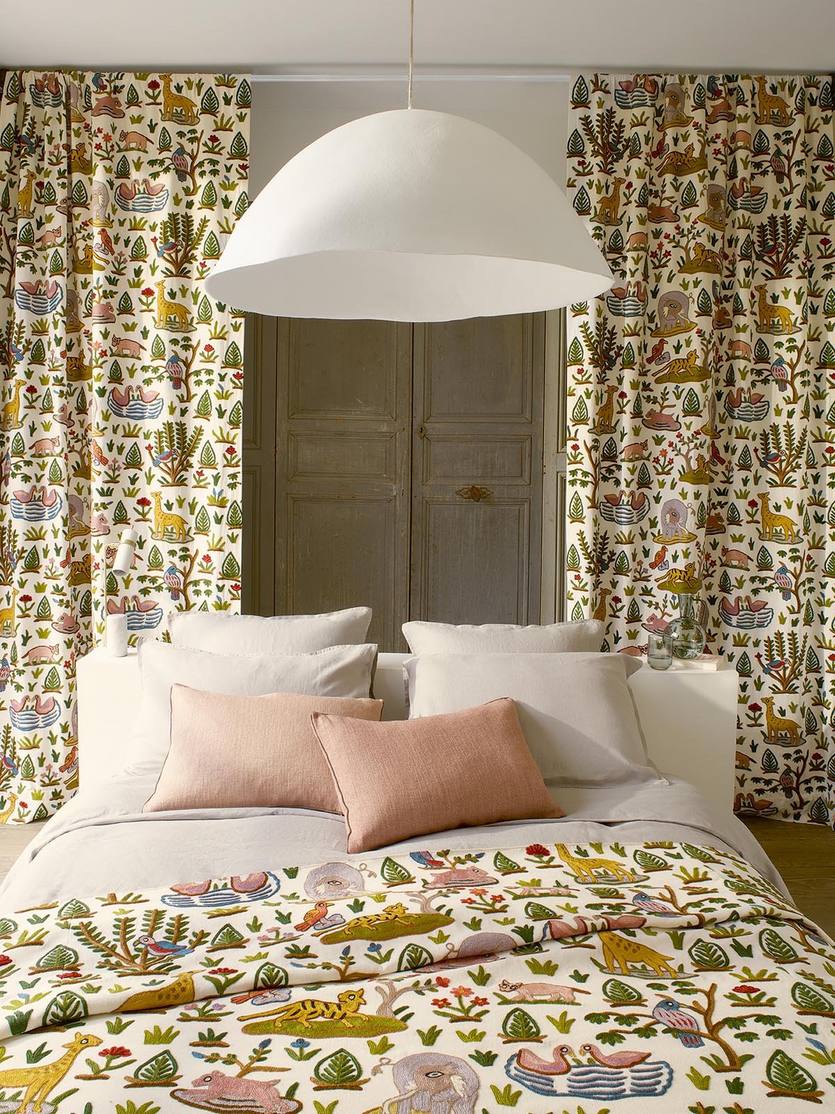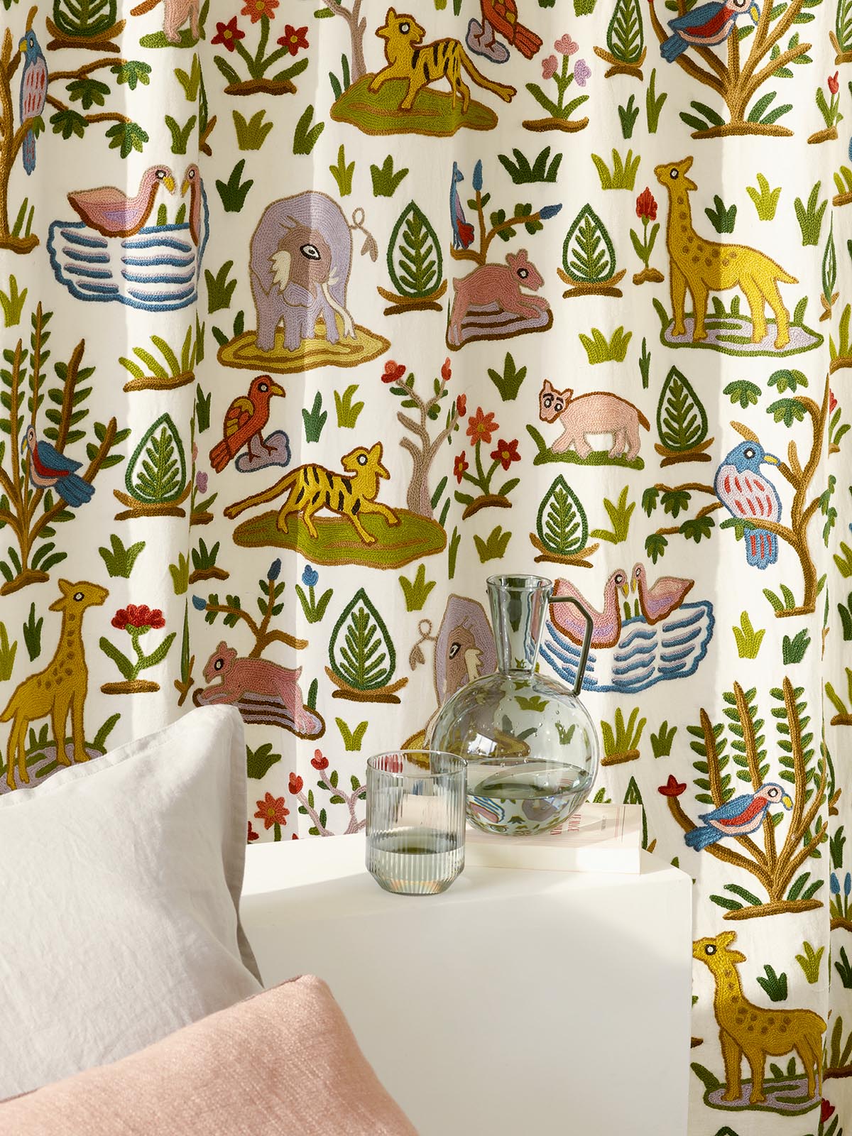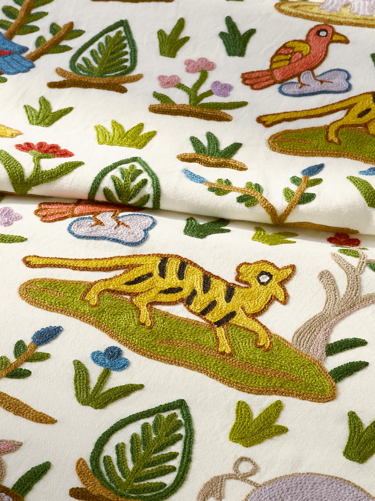 Naïve et charmante, cette broderie main dont le motif s'inspire d'indiennes traditionnelles, évoque une scène de jungle primitive, comme un rêve de paradis perdu.