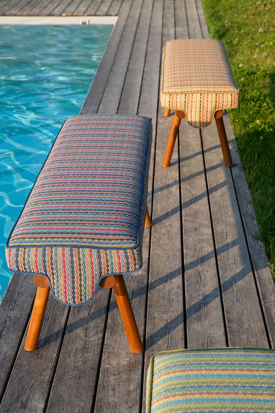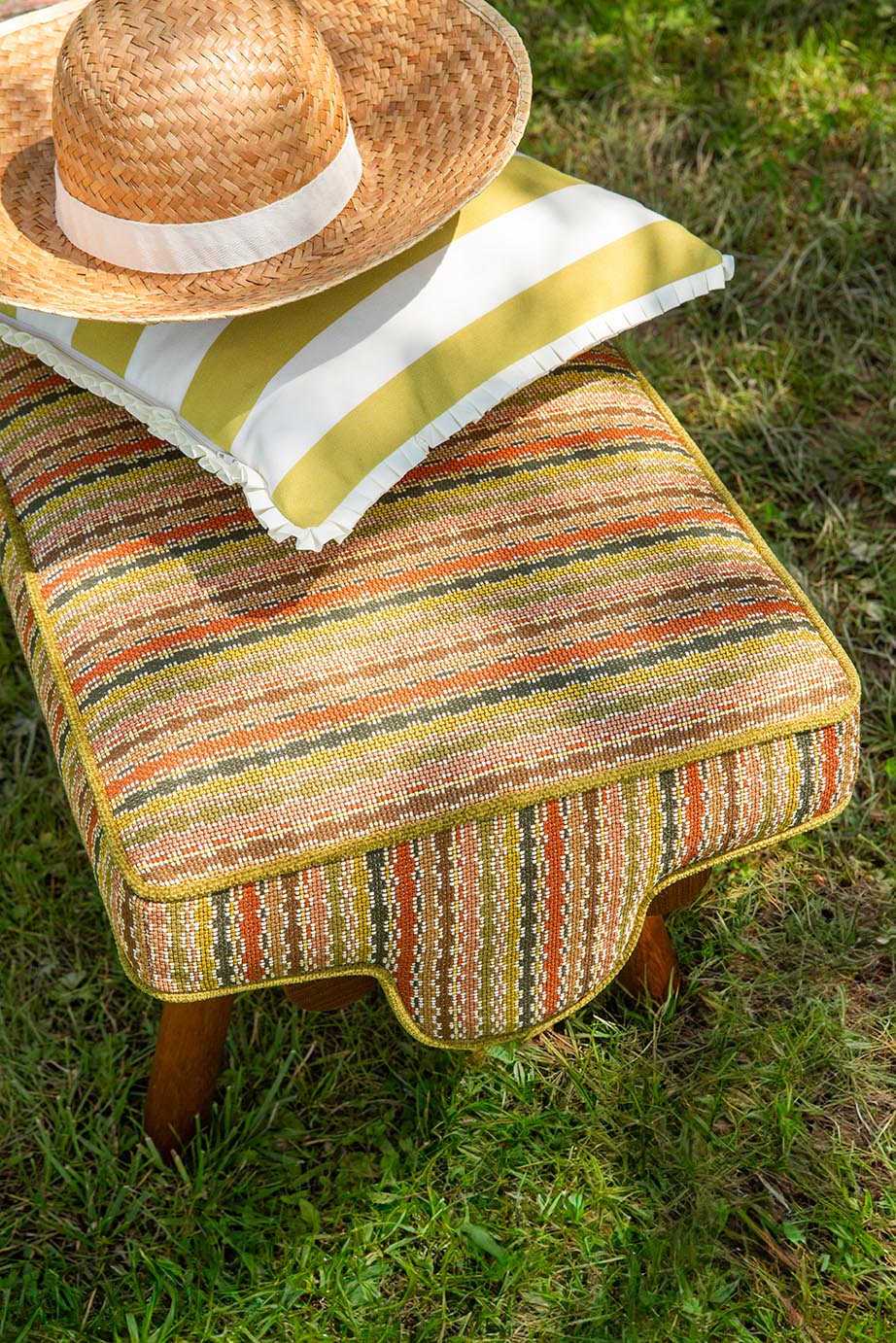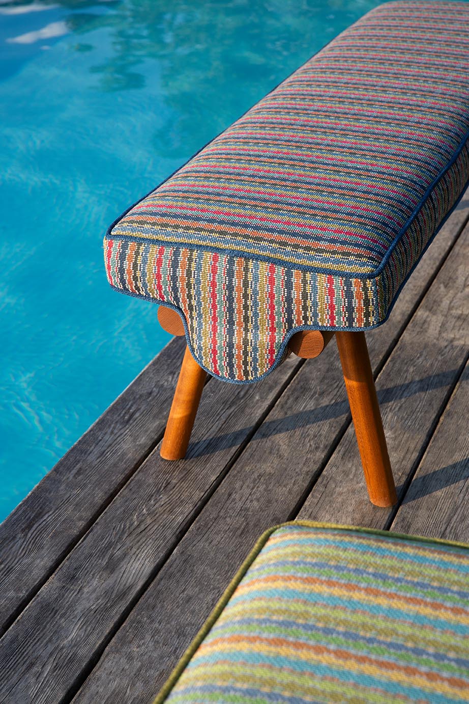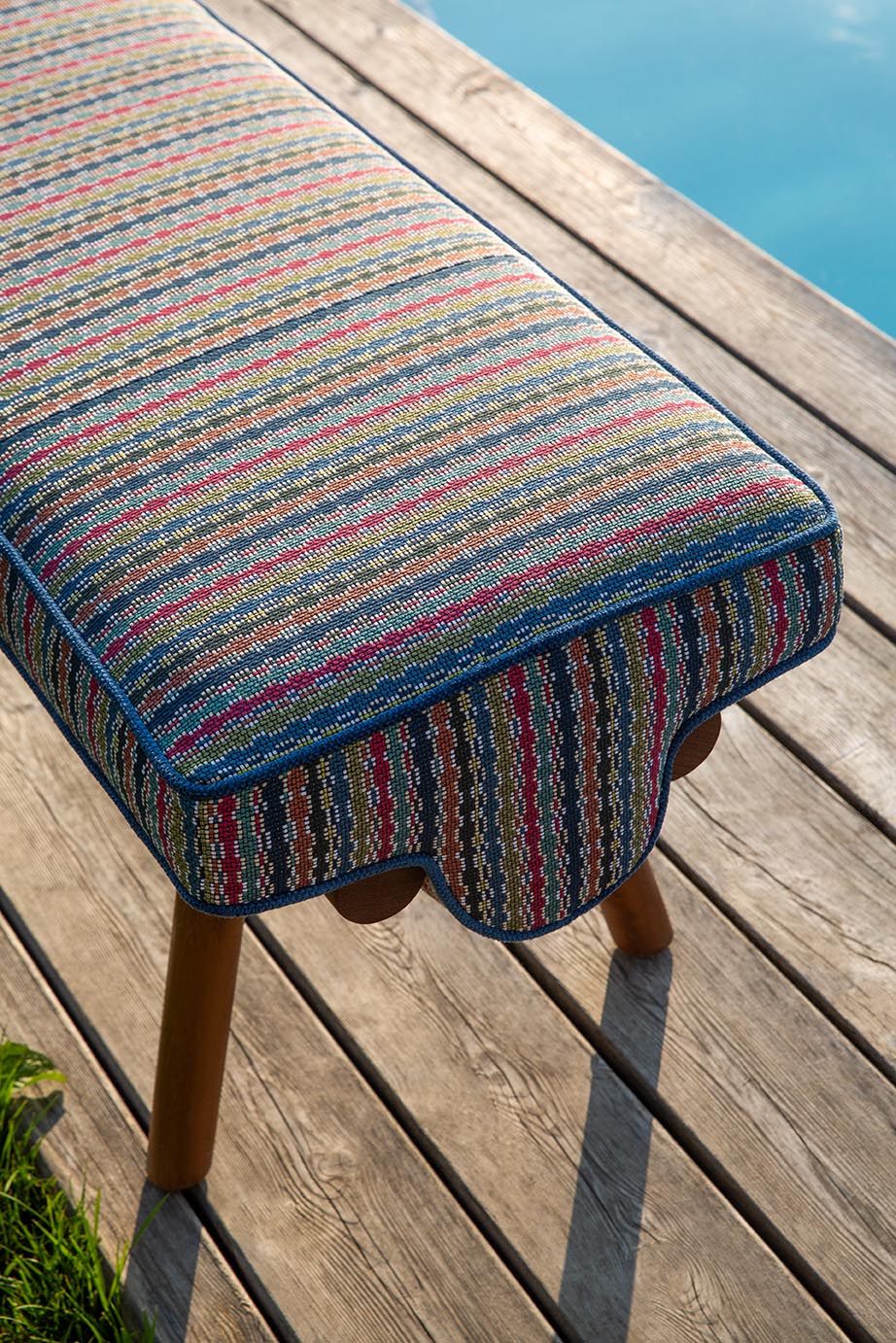Tissu haute performance In-Outdoor, cette rayure épinglée multicolore et irrégulière fait écho à une nature vibrante et généreuse. Elle est tissée dans les ateliers Pierre Frey du nord de la France labellisés EPV et experts en Europe dans le tissage de textiles résistants à la lumière et antitache.
