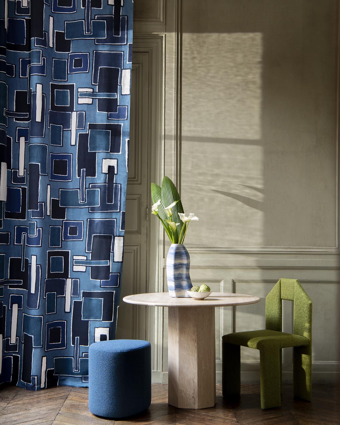 Magnifique motif de rectangles irréguliers imprimés sur lin dans des teintes indigo lumineuses et profondes, MEDINA est une évocation abstraite et puissante des Kasbahs du nord de l’Afrique.