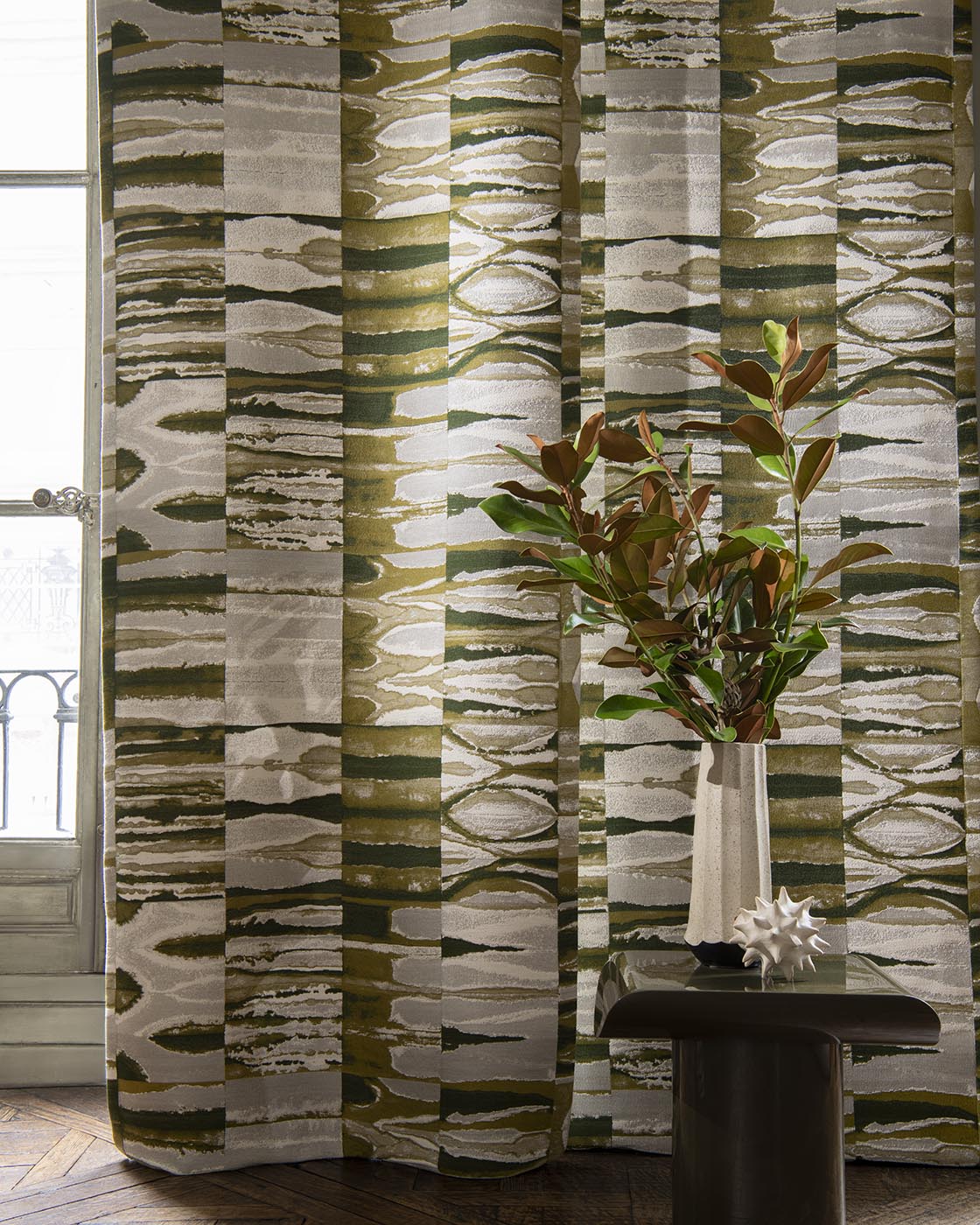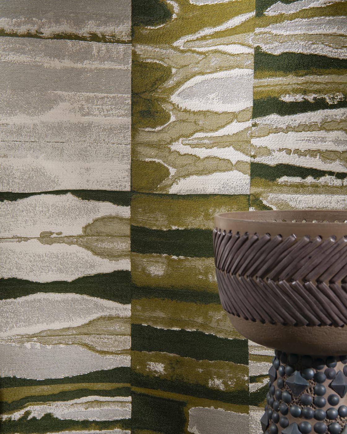Ce jacquard texturé réinterprète fidèlement une œuvre contemporaine d’Adrien Testard. Son travail s'inscrit dans l'art du pliage. Il joue avec la propagation de l'encre qui fuse sur des papiers japonais pliés, générant de multiples textures paysagères et variations colorées. L'œuvre d'Adrien, une fois dépliée, est une ode aux illusions et aux mirages que l'on voit aux portes d'un désert, là où les eaux disparaissent. Existe également en papier peint coordonné sous la référence AGAFAY FP152.