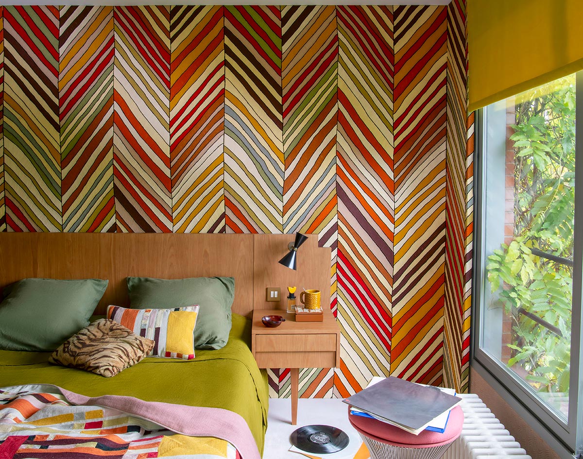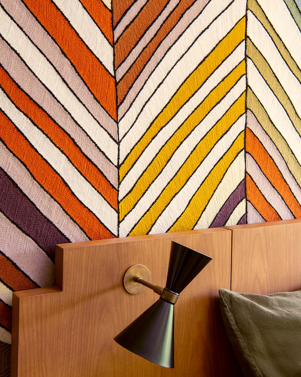 Avec son spectaculaire motif chevron, cette broderie alterne habilement sertis noirs en relief et aplats aux couleurs chaudes pour créer une composition dynamique. Les variations de textures ajoutent de la profondeur, tandis que les teintes éclatantes apportent une touche d’énergie à l'ensemble.